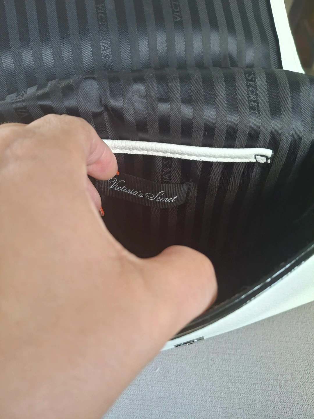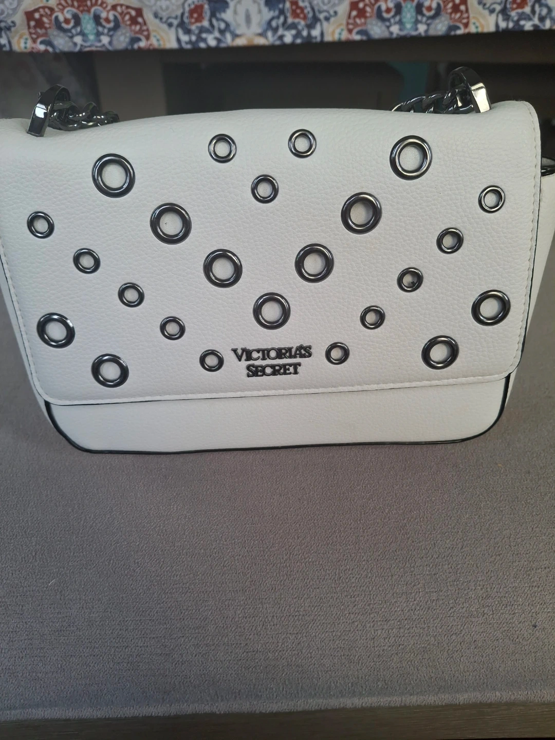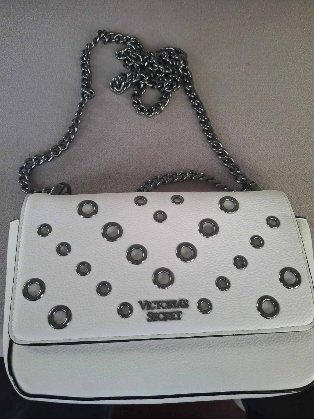 Selling a stylish Victoria's Secret shoulder bag in white! It features a unique design with silver eyelet details and a chain strap. Perfect for adding a touch of edgy elegance to your outfit