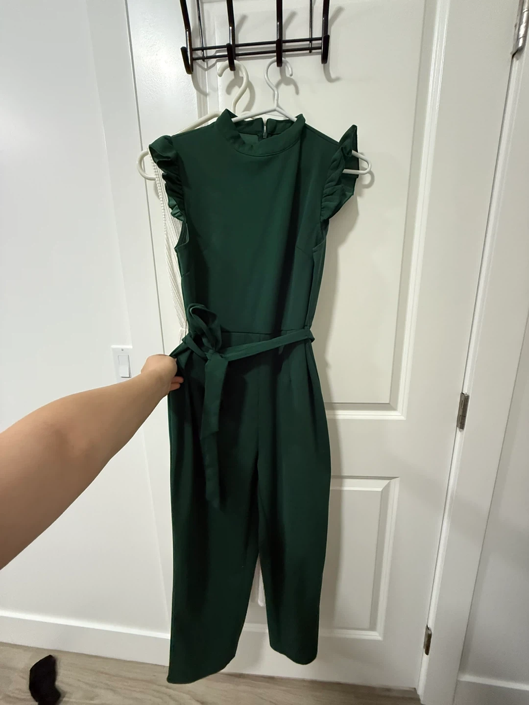 Selling a cute green jumpsuit! It features a high neckline, short flutter sleeves, and a matching belt to cinch the waist. Perfect for a night out or a special occasion