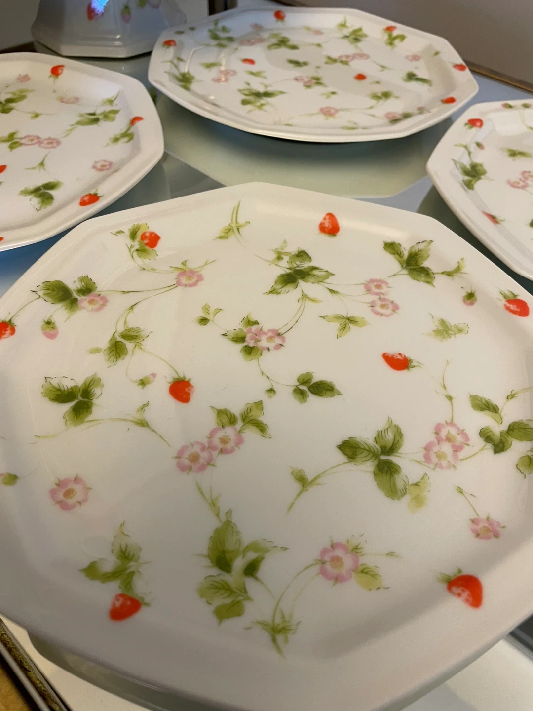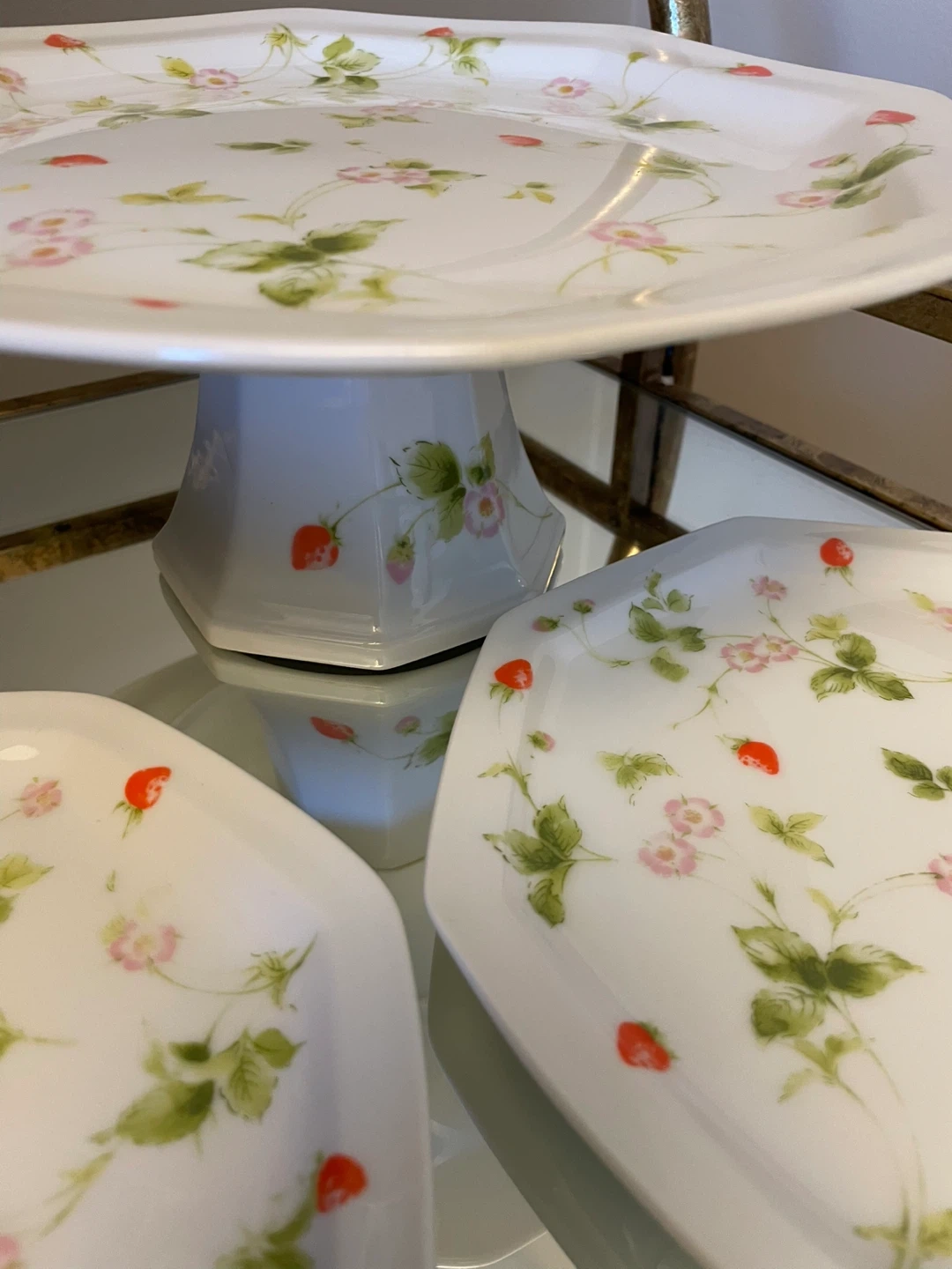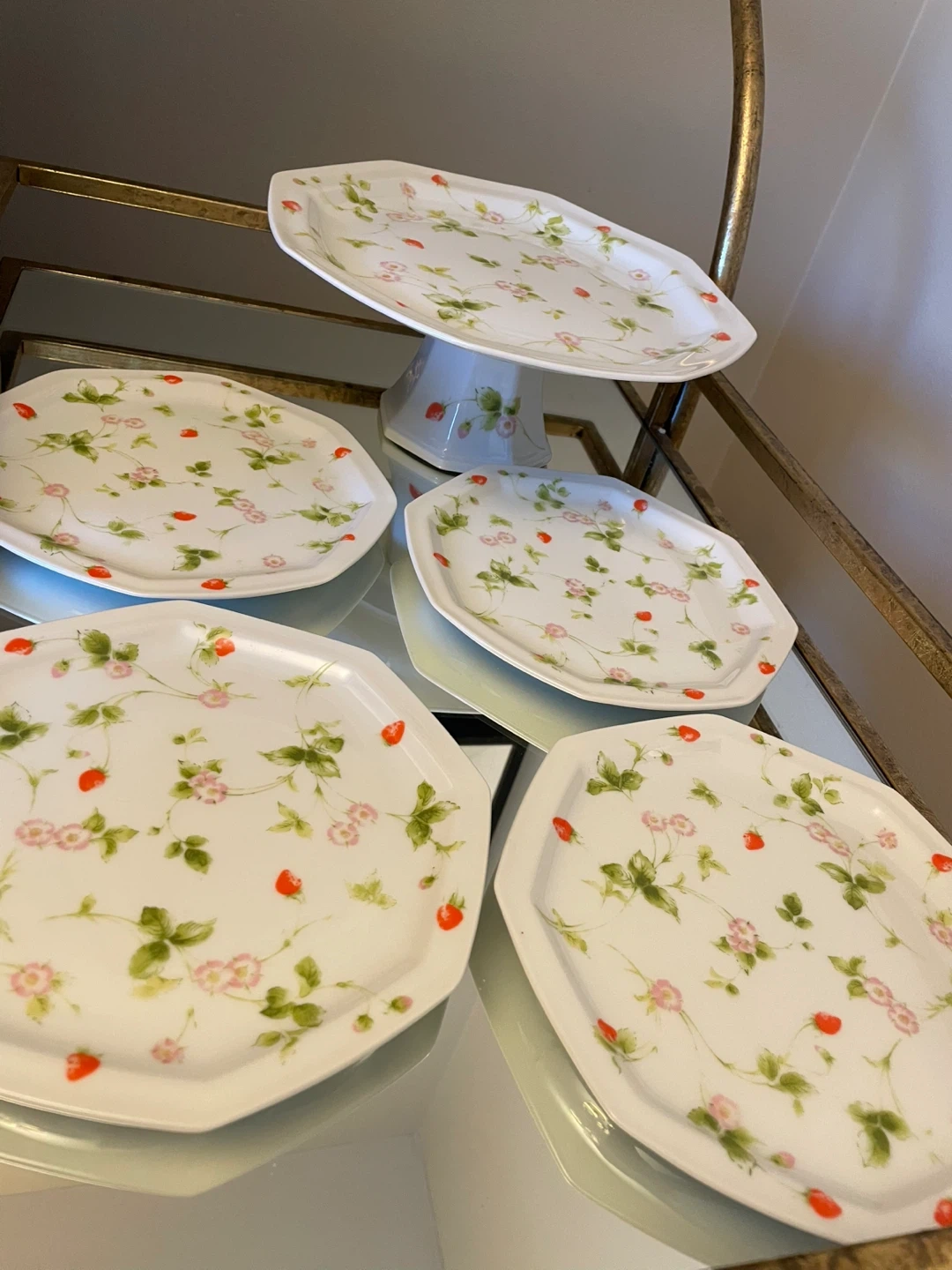 Lovely set of dessert plates with matching cake stand featuring a charming strawberry design. Perfect for adding a touch of sweetness to your tea parties or special occasions