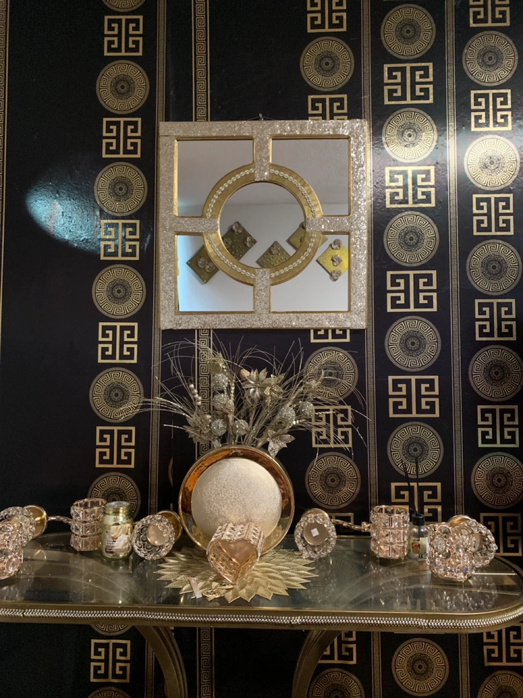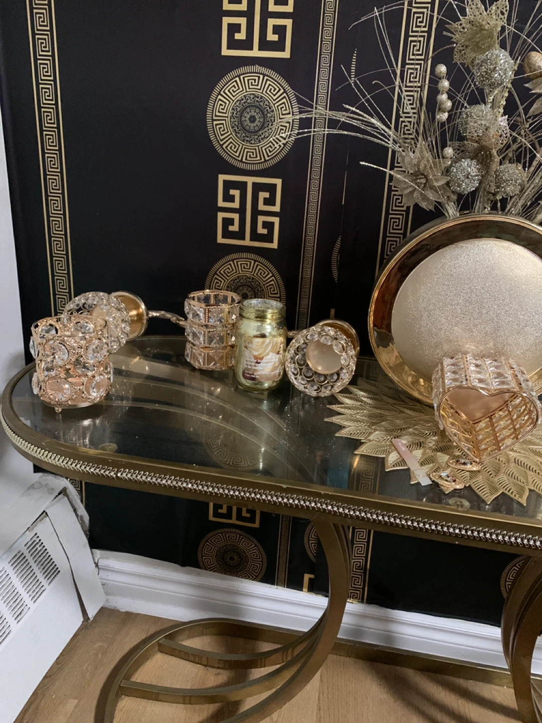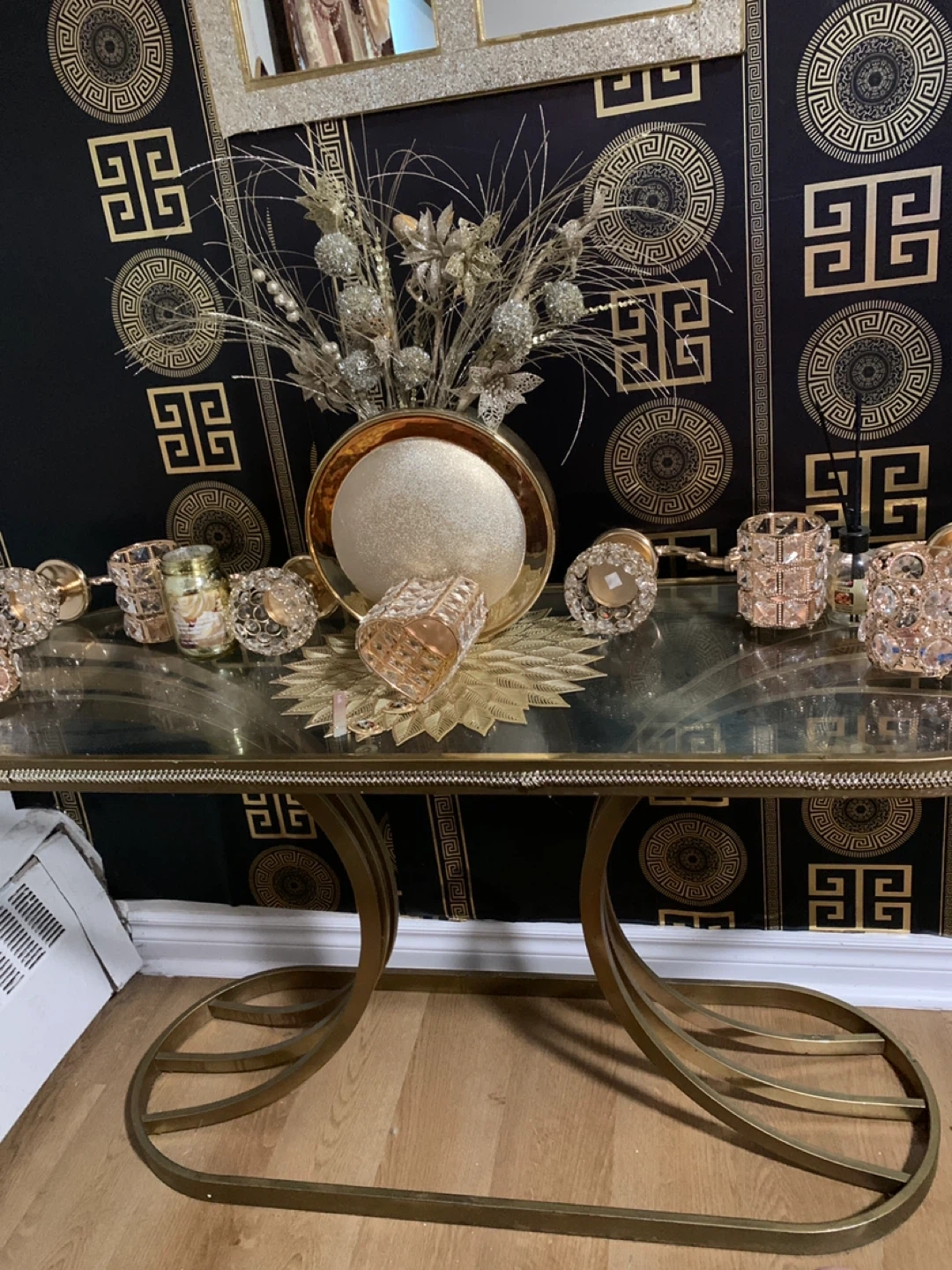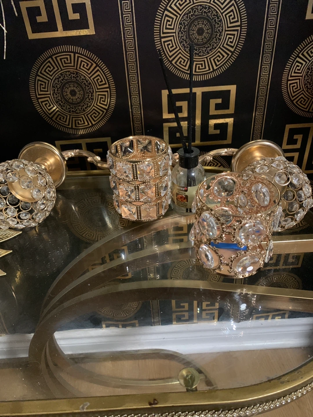86Selling all mirror and table set of gold decorative candle holders. They add a touch of elegance to any room! Perfect for creating a warm and inviting atmosphere in your home