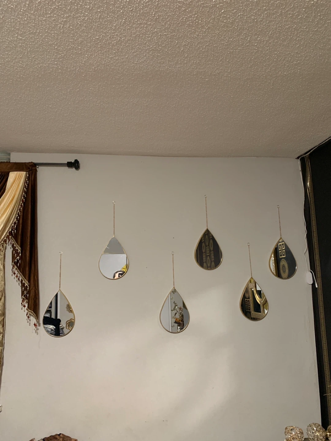 86Selling a set of six teardrop-shaped hanging wall mirrors! They're in great shape and would add a nice touch to any room. The mirrors have a gold trim and a unique teardrop design, making them a stylish addition to your home decor