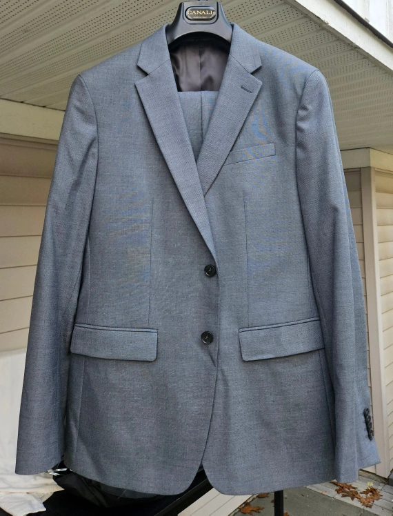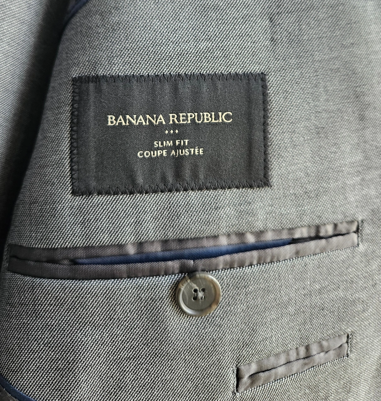 1000+Banana Republic 2 PC Slim Fit 100% Wool Suit Grey Size 42R - Pants 34 / 34 Like New This Banana Republic two piece slim fit 100% wool suit was used as a store display model. This suit has never been work, outside of the store. The blazer and pants have no rips, tears, holes or stains of any kind. This Banana Republic slim fit suit comes in grey blazer size 42R and grey pants 34 waist/ 34 inseam. The blazer and pants have never been altered, all original. Please Note, the suit does need to be pressed.