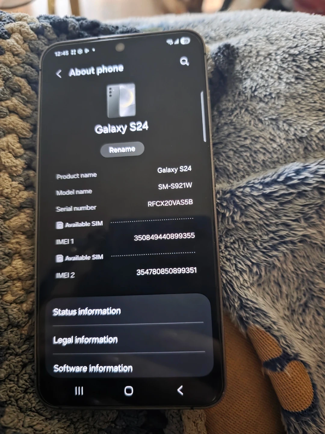 Selling a Samsung Galaxy S24, model number SM-S921W. The security patch is updated to October 1, 2025