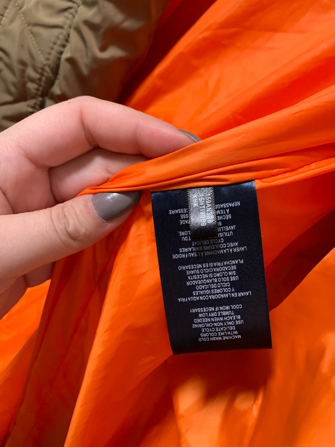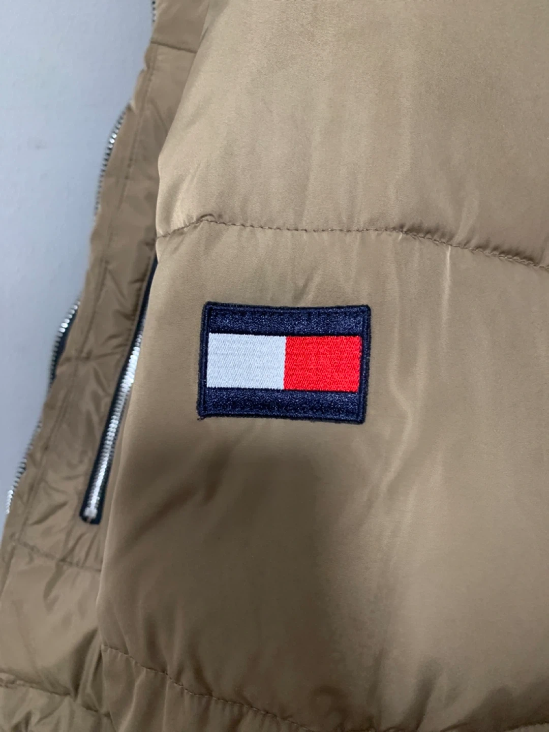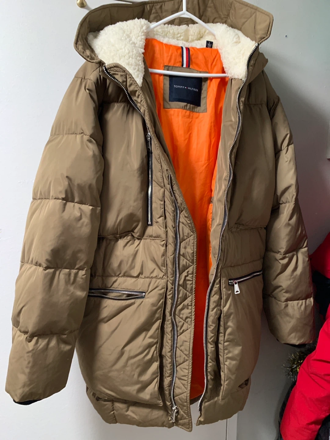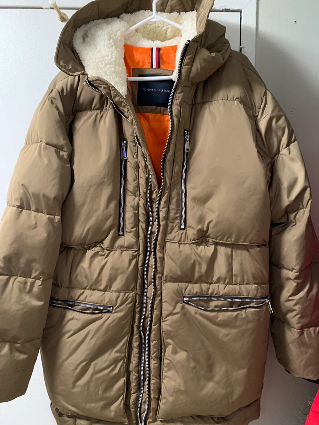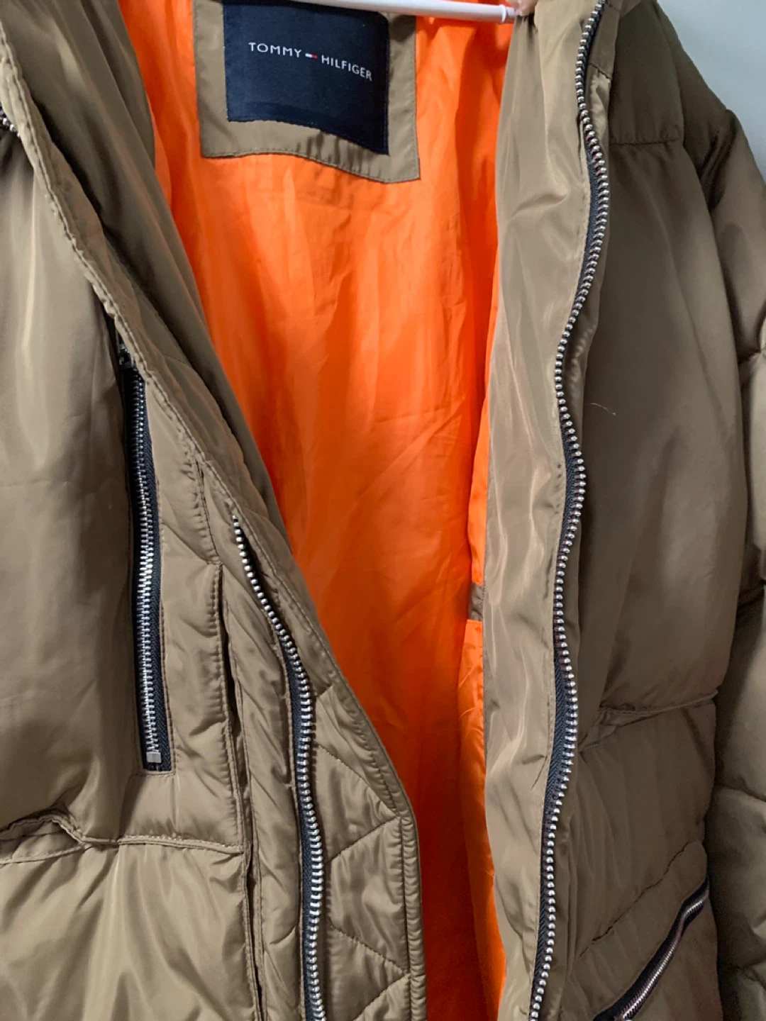 86Tommy Hilfiger puffer jacket in size L. It's a nice, warm jacket for the cold weather! The jacket is brown with an orange interior.