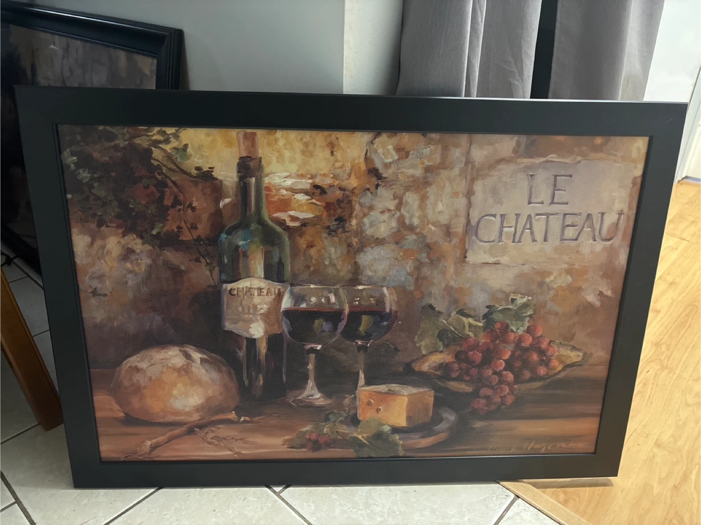380This framed painting features a rustic still life with wine, bread, cheese, and grapes, perfect for adding a touch of French countryside charm to your dining room or kitchen; it's in good condition. * Framed and ready to hang * Classic design * Dimensions: 26 x 38 inches This painting is just waiting to be the talk of your friends during your next dinner party! Don't miss out on this chance to own a piece of rustic charm. If the ad's up, the painting's available—snatch it up before it's gone!