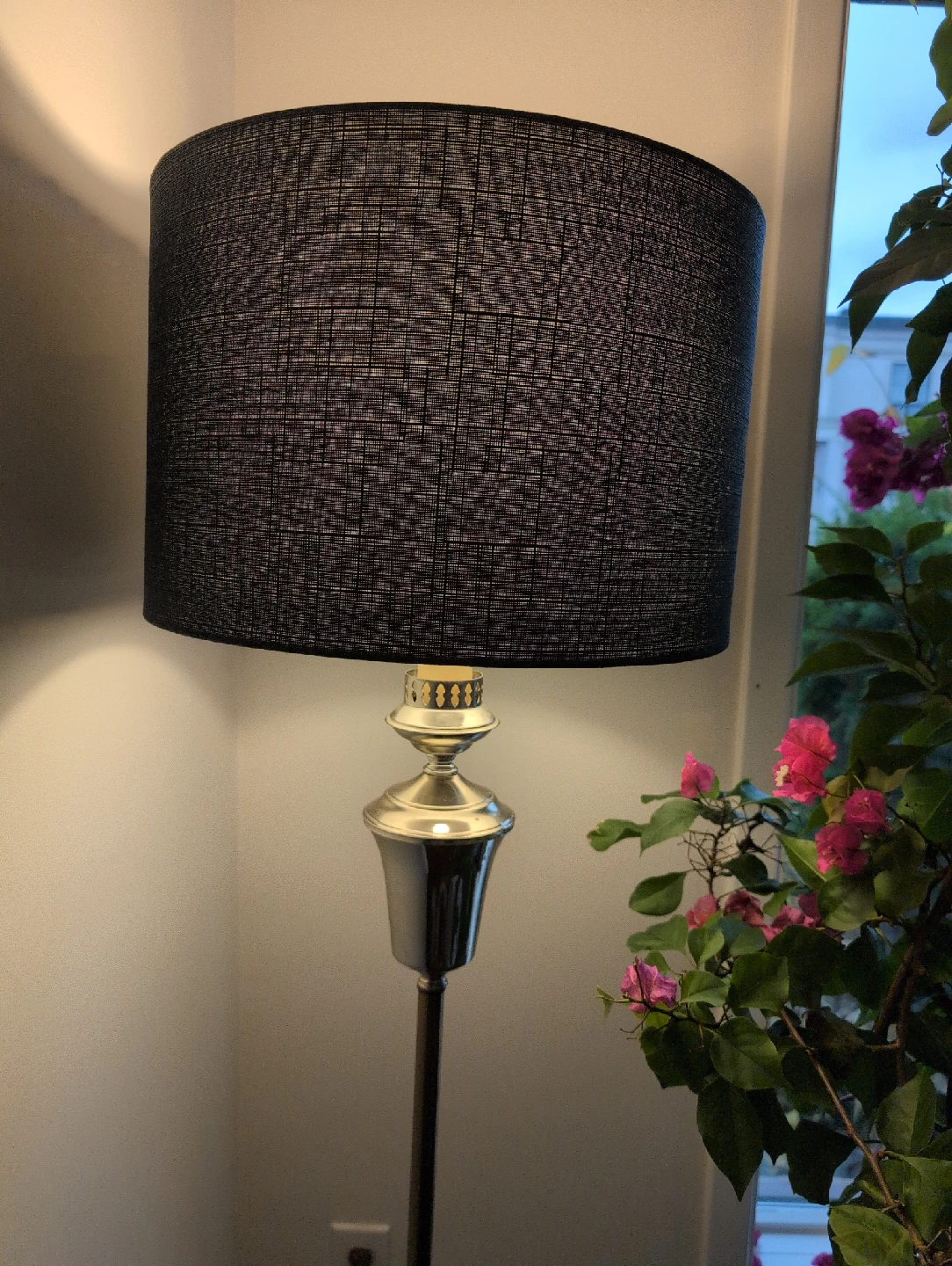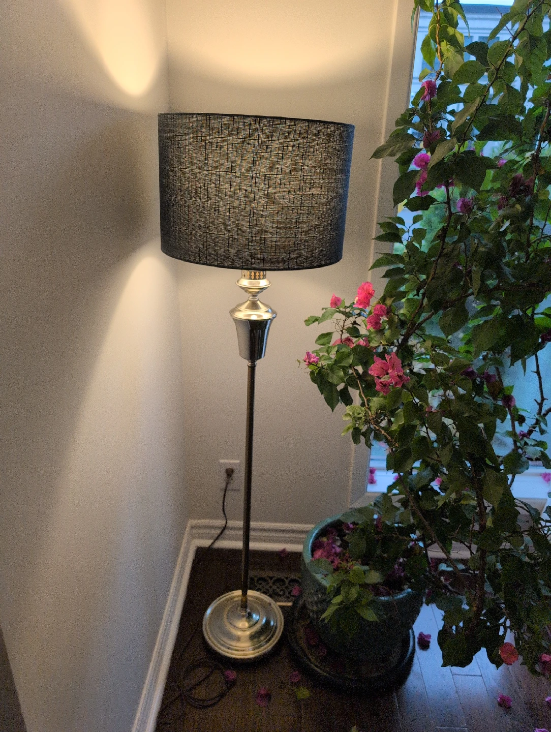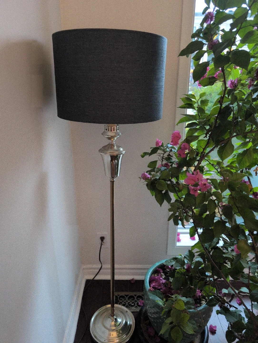 This floor lamp has a sleek design with a dark blue shade and a brass base. It's in great condition and would look lovely in any room. It provides a nice ambient light for reading or relaxing