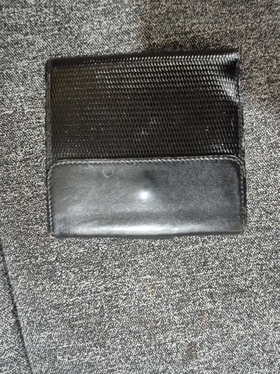 Selling a vintage Gucci black leather wallet. It features a unique textured design on the main body and a smooth leather accent at the bottom. The wallet has a snap closure with a distinctive logo. It's in good condition for its age!