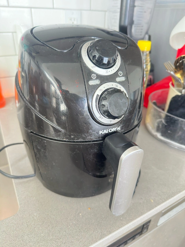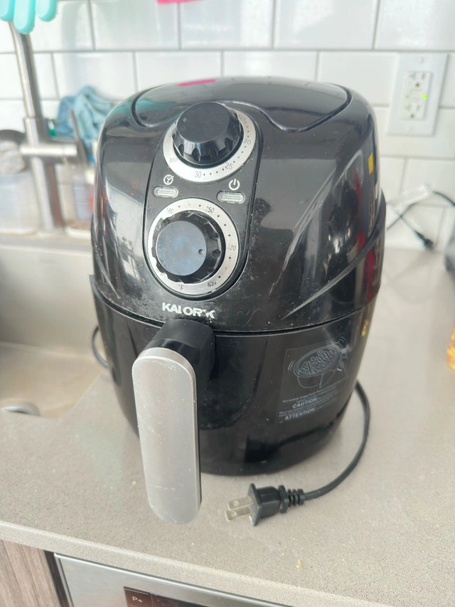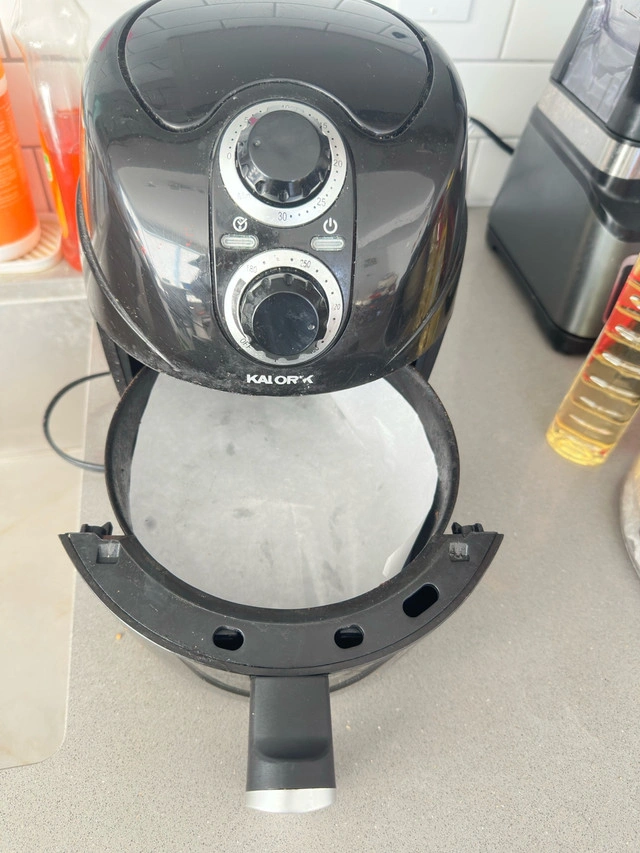 Selling a used Kalorik air fryer. It's black and has a handle for easy use. It has some signs of use, but it's still functional and ready to use for your cooking needs