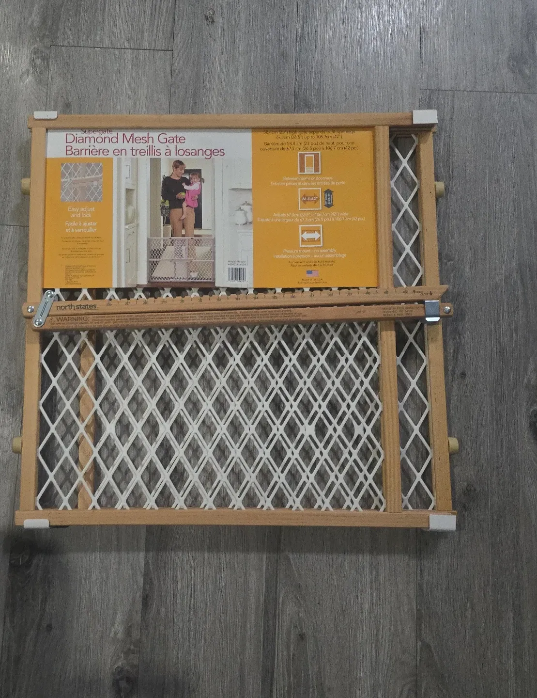 Selling a Supergate Diamond Mesh Gate. It expands to fit openings from 26.5" to 42" wide and is 23" high. Perfect for between rooms or doorways. Easy to adjust and lock!