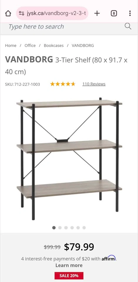 Bought from JYSK a couple years ago for $100. It's now on sale for $80. It's in great condition and is a good shelf. Selling because it no longer goes with my new space.