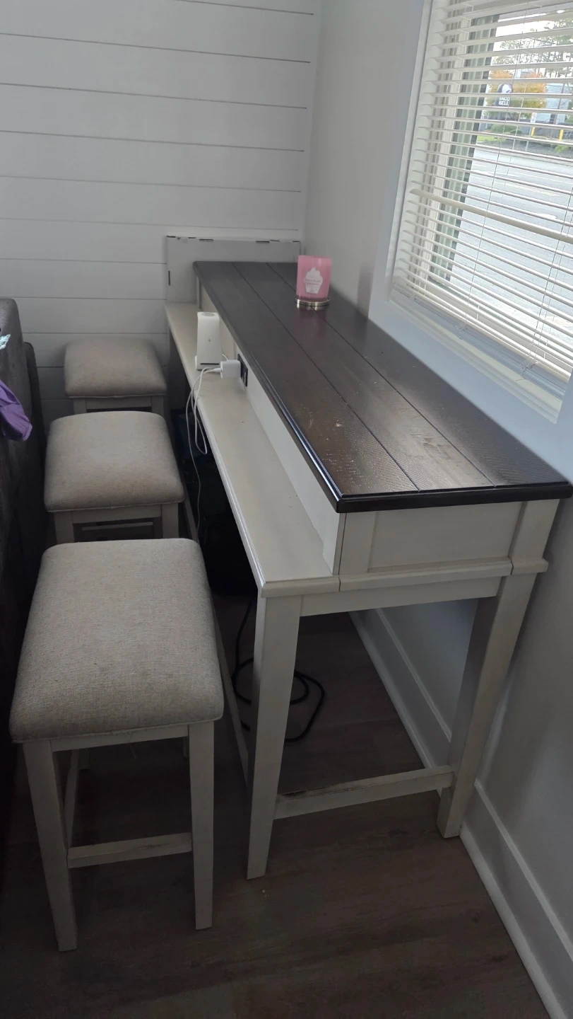 Selling a counter height table that comes with three matching stools! It's a great set for a smaller space or to add extra seating to your kitchen or dining area. The table features a dark wood top and a white base, and the stools have neutral-colored cushioned seats