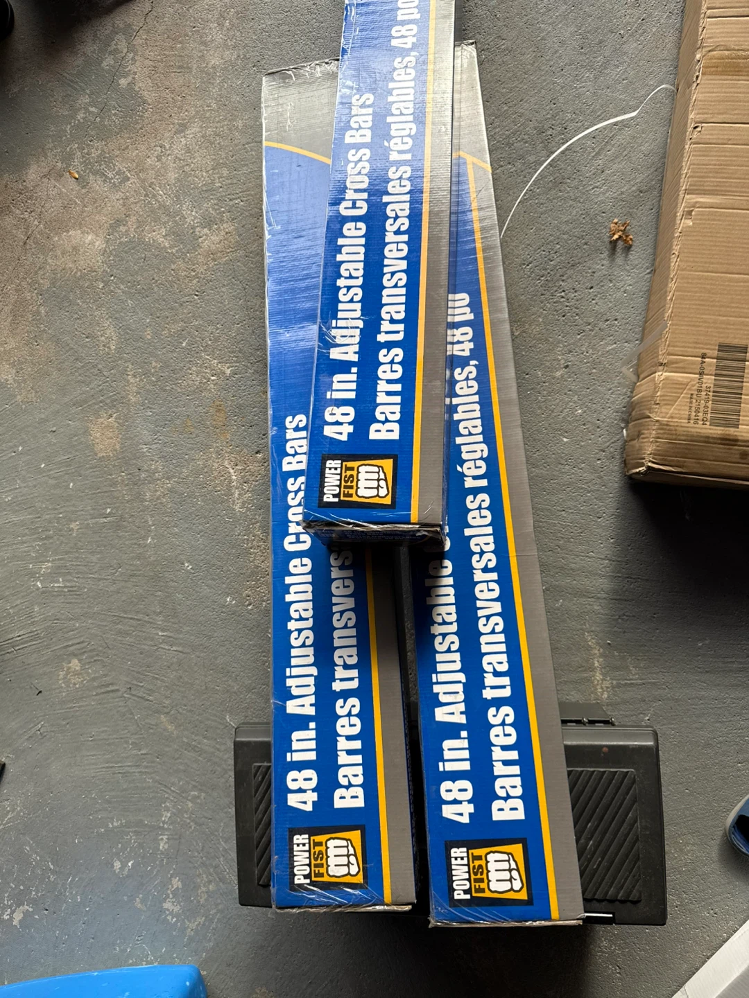 Selling a brand new set of Power Fist 48 inch adjustable cross bars! They have a capacity of 110 lb and are made of steel. Length is 4.03 ft and height is 0.35 ft
