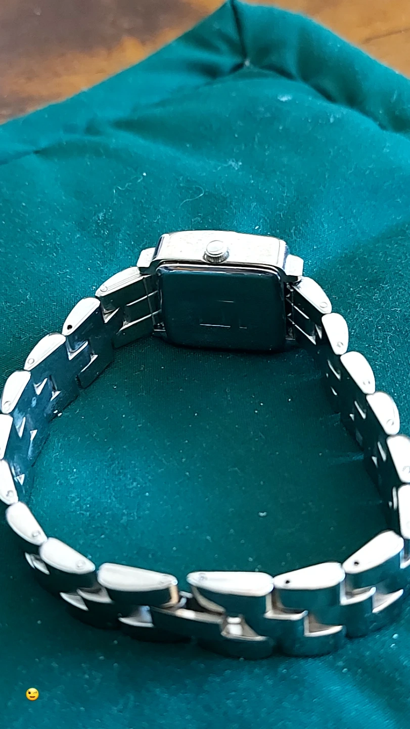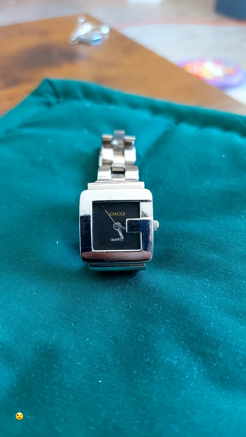 This is a Gucci quartz wristwatch with a silver-tone metal band and a black face. It's a stylish accessory for everyday wear. The watch features a classic G-shaped detail on the bezel.