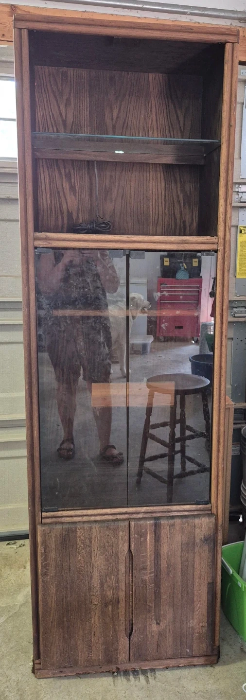 Selling a wooden display cabinet with glass shelves. It has a lower cabinet with doors and a mirrored section. Perfect for displaying your favourite items or storing things neatly!