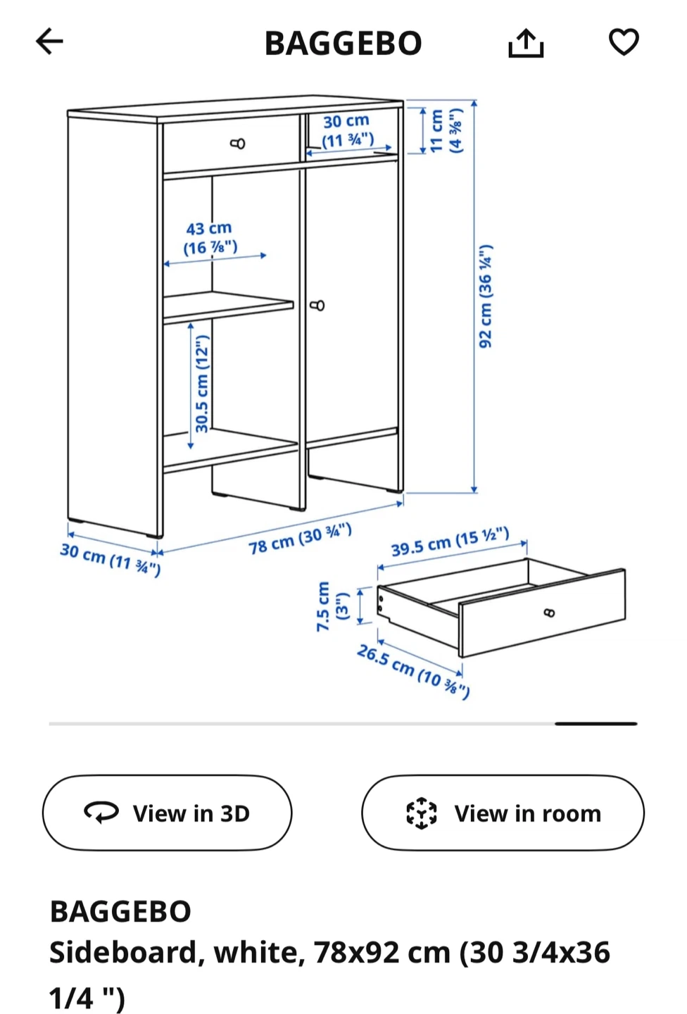 Selling a white IKEA BAGGEBO sideboard in great condition minor scratches and small pen mark in the bottom of the drawer. It measures 78x92 cm (30 3/4x36 1/4 "). Perfect for extra storage in any room