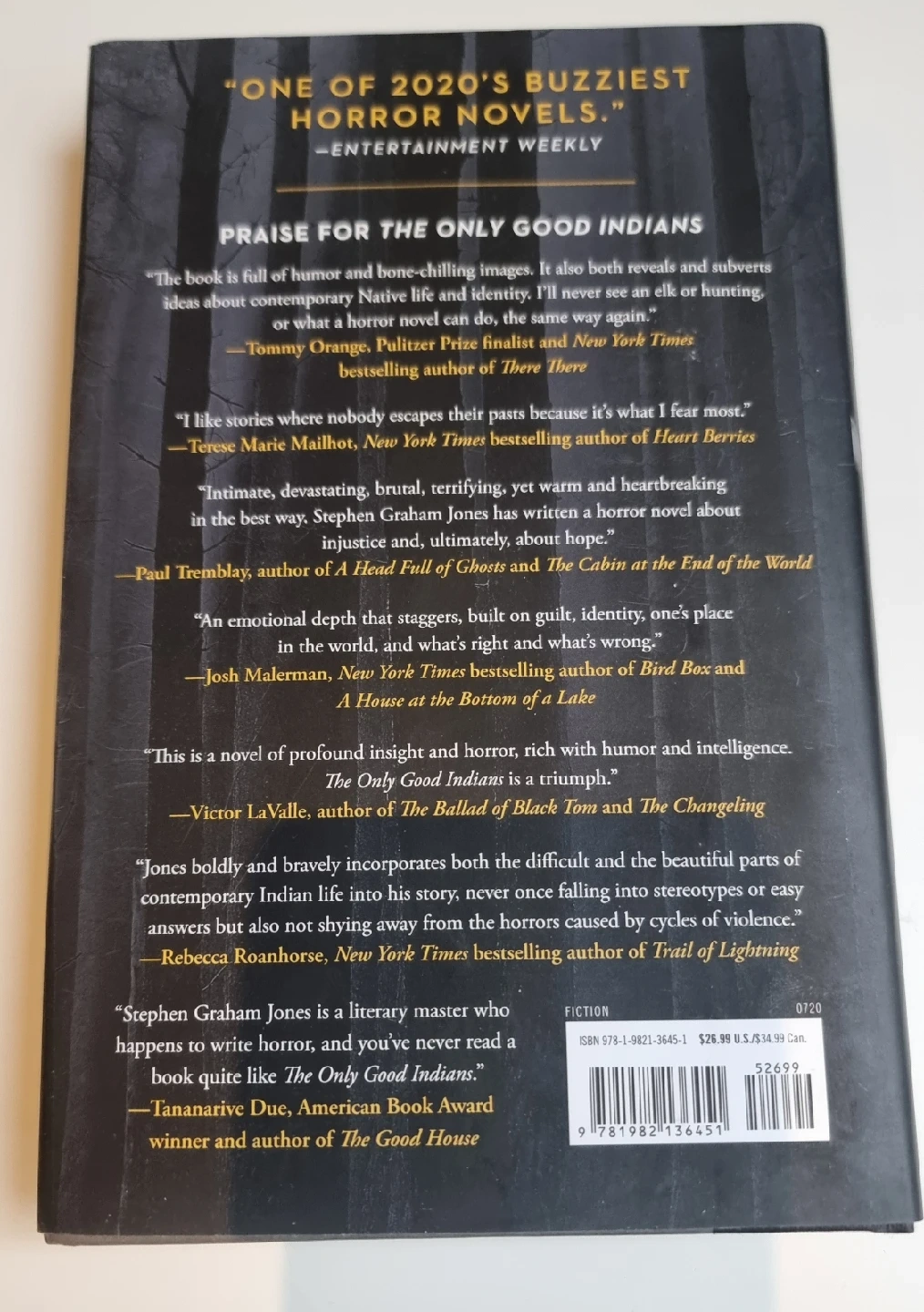 Selling a copy of "The Only Good Indians" by Stephen Graham Jones! It's a novel that explores contemporary Native life with horror elements.