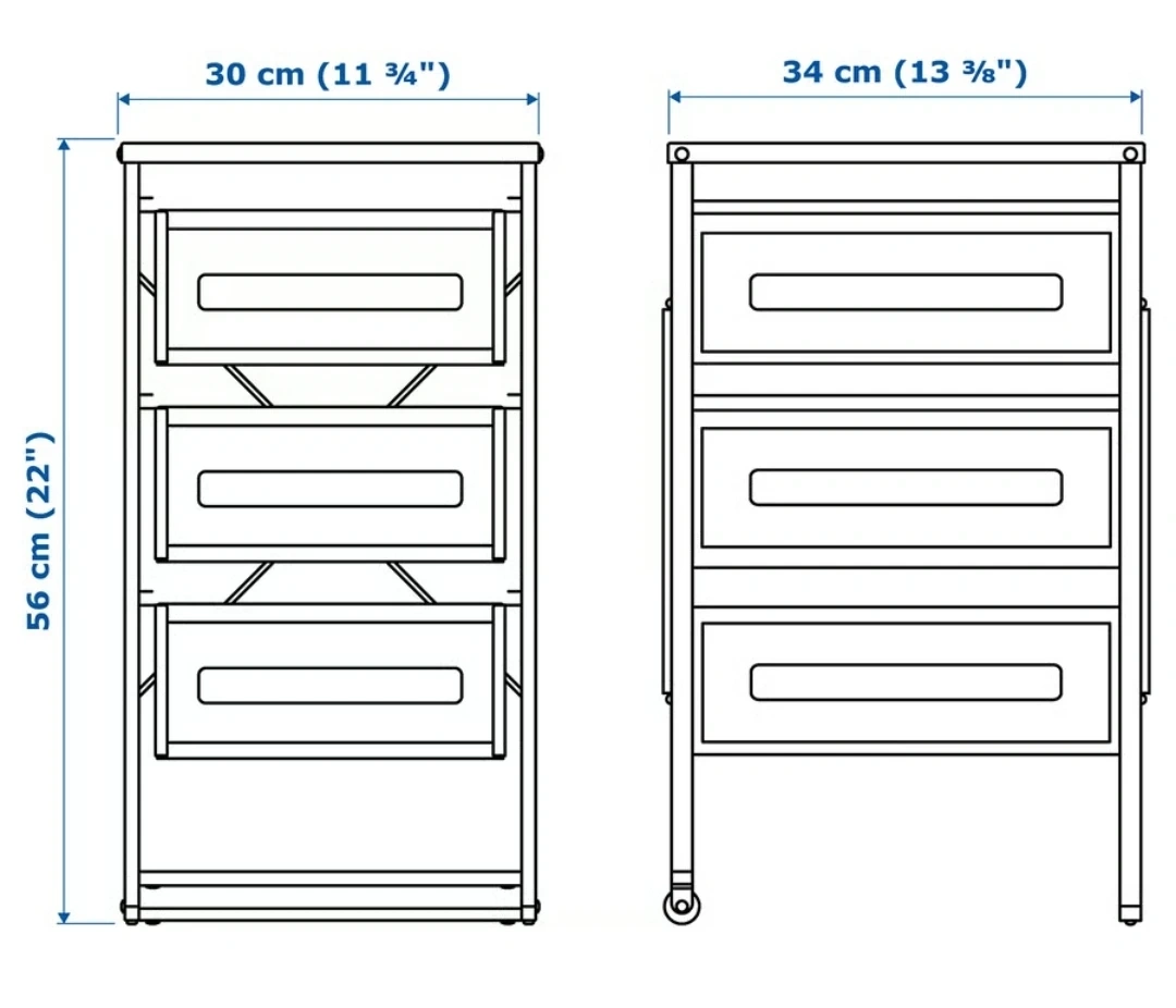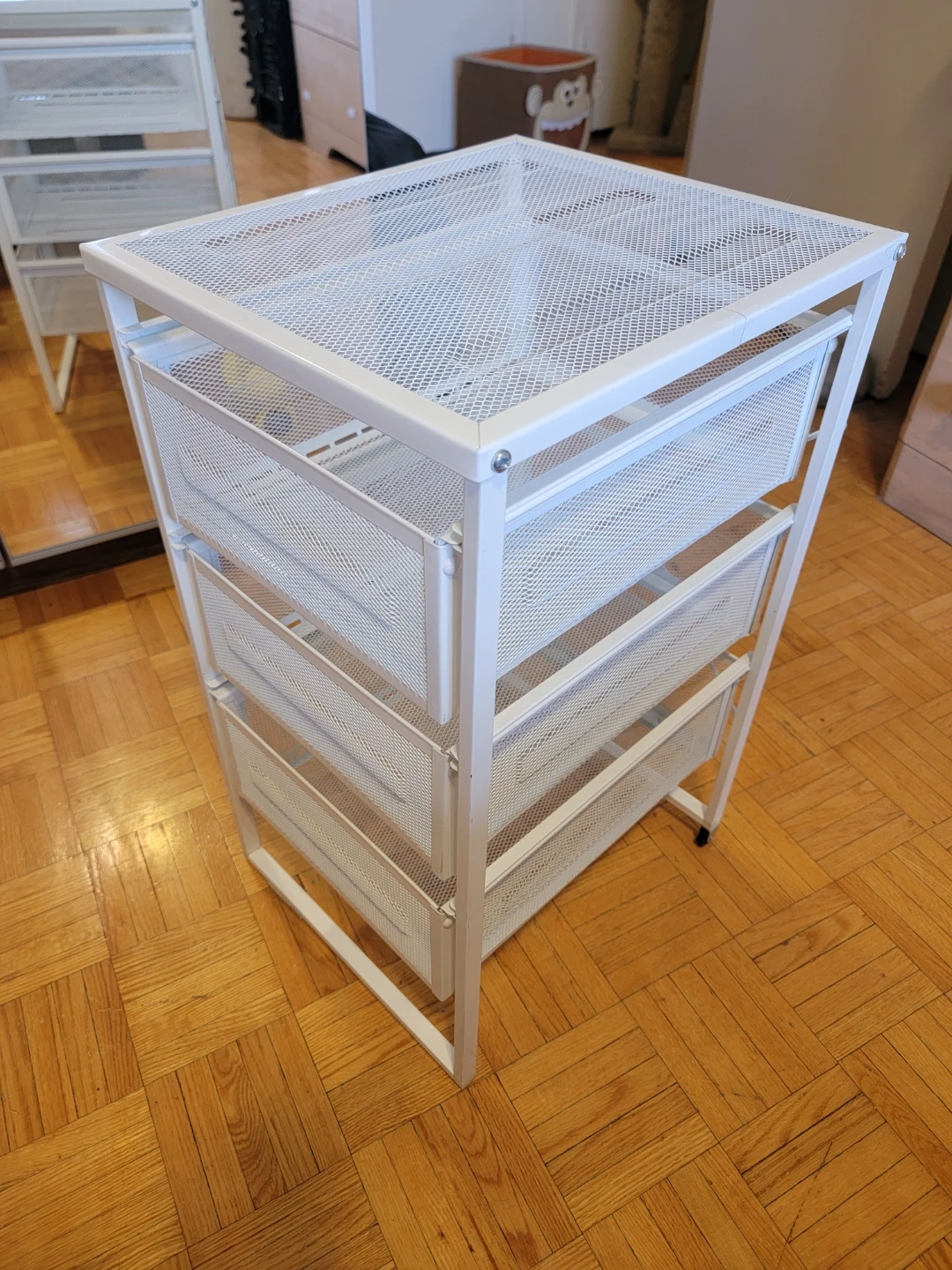Pick up 23 lascelles blvd White metal three-drawer unit. Mesh drawers and a metal frame. Excellent condition. It's in great shape and ready to help you organize your space. The dimensions are approximately 30 cm (11 3/4") wide, 34 cm (13 3/8") deep, and 56 cm (22") tall. Originally bought for $24.99.