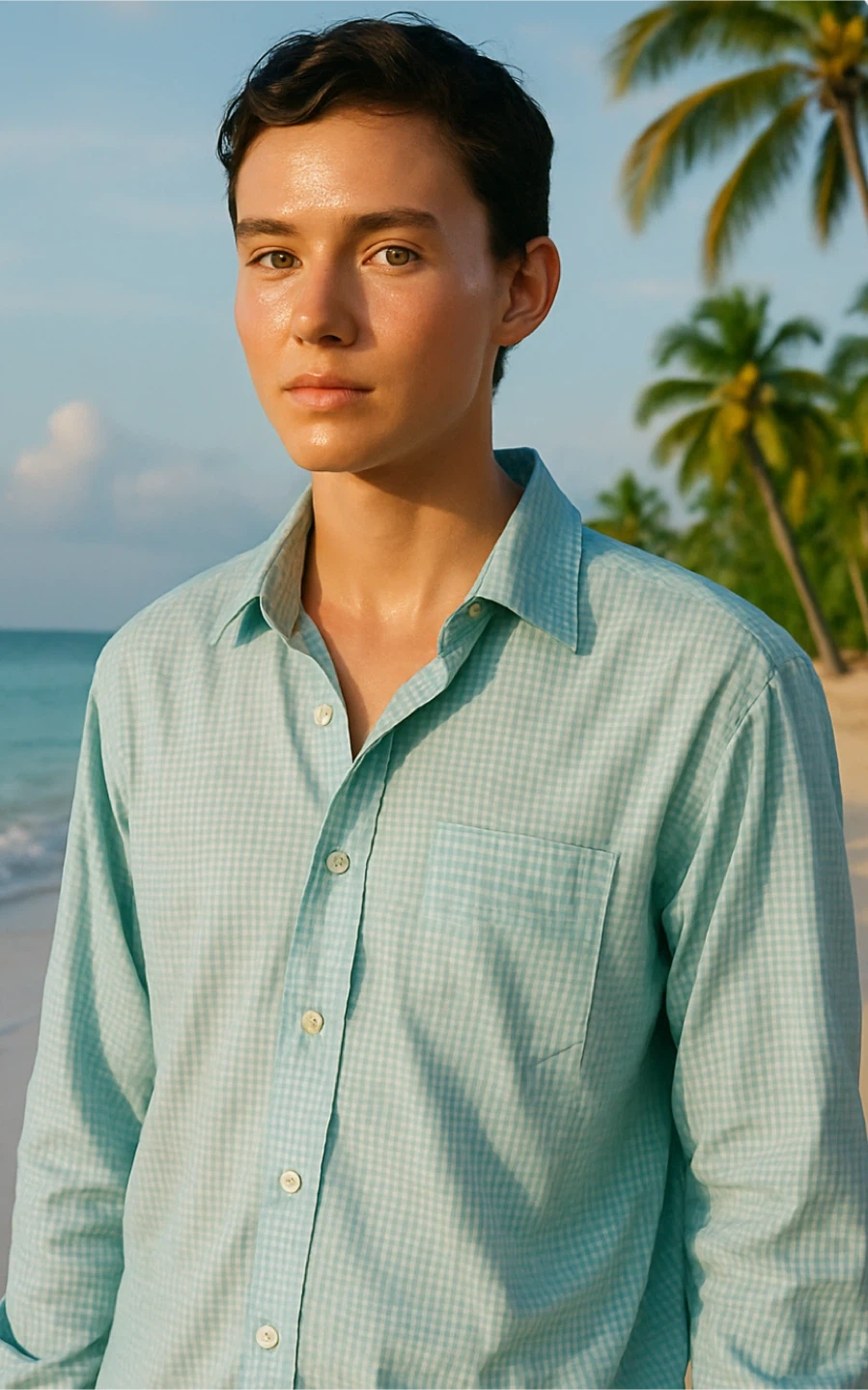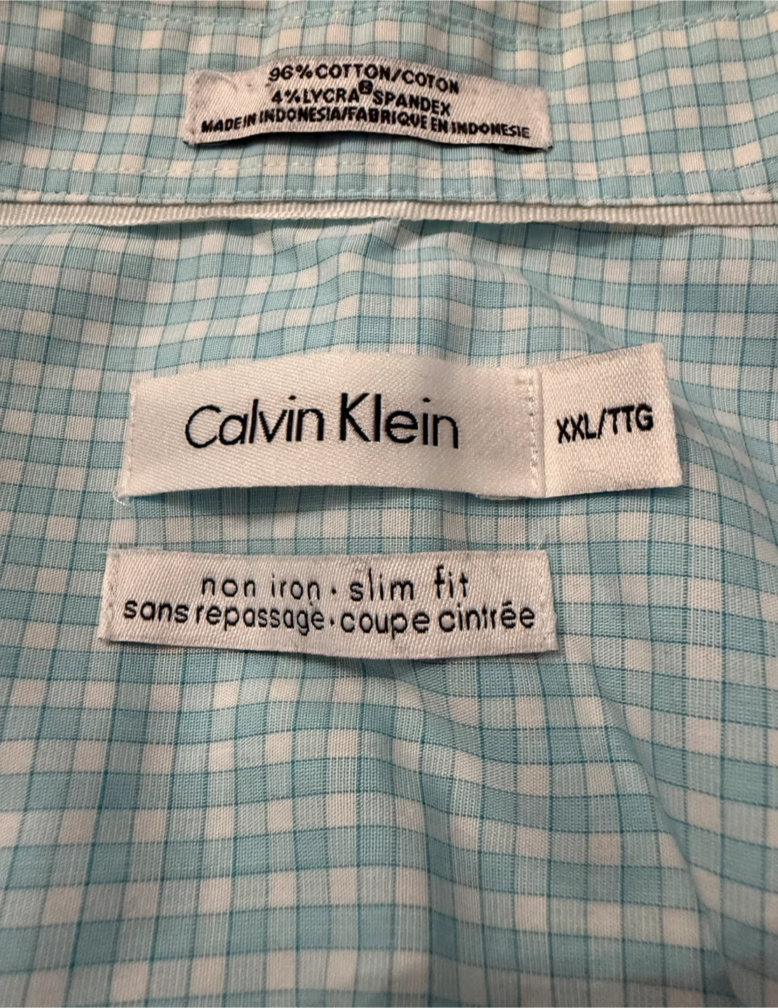 Selling a Calvin Klein button-down shirt in size XXL. It's a light blue and white checkered pattern. The material is 96% cotton and 4% lycra spandex. It is a non-iron slim fit shirt.