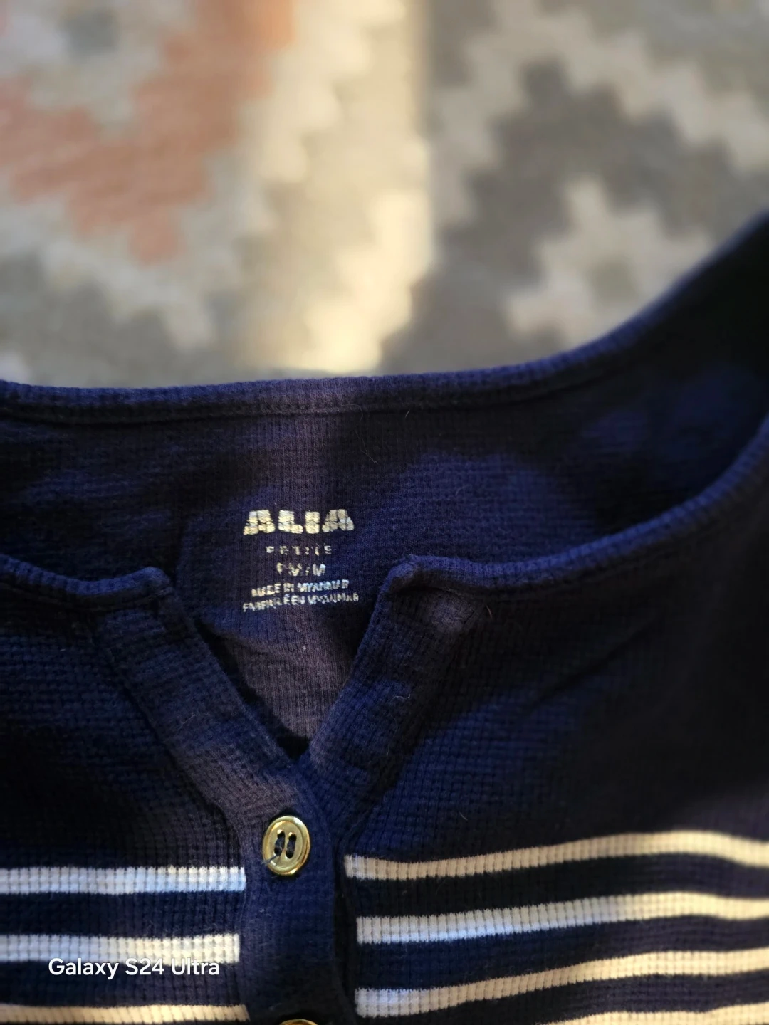 This is a cute Alia long-sleeved top in a petite medium size. It features a navy blue and white striped pattern, perfect for a casual look. It's in great condition and ready for a new home!