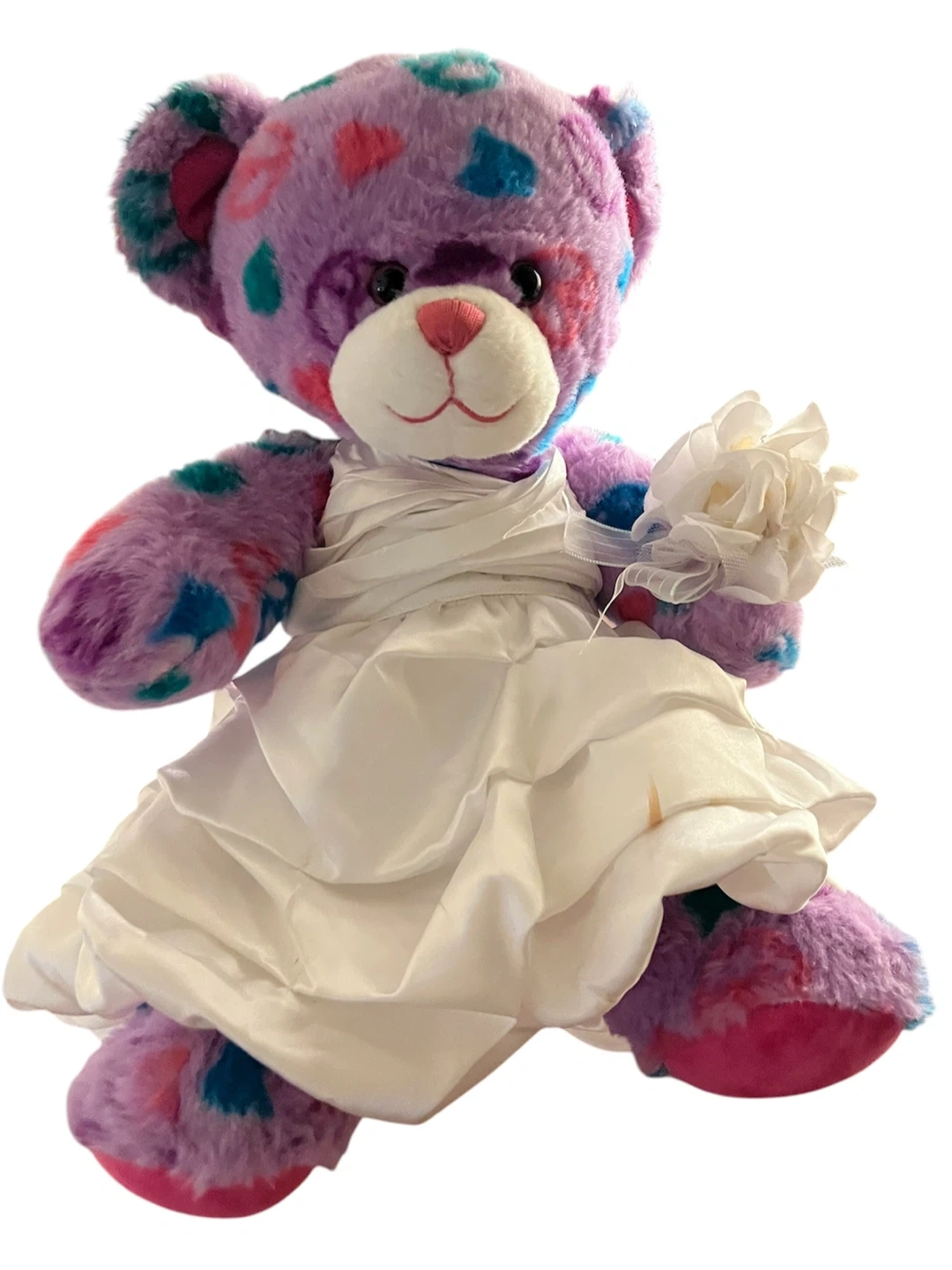 123This Build-A-Bear plush is ready to walk down the aisle! It's a cute purple bear with colourful spots, dressed in a white wedding gown and holding a bouquet. Perfect for a collector or as a gift!