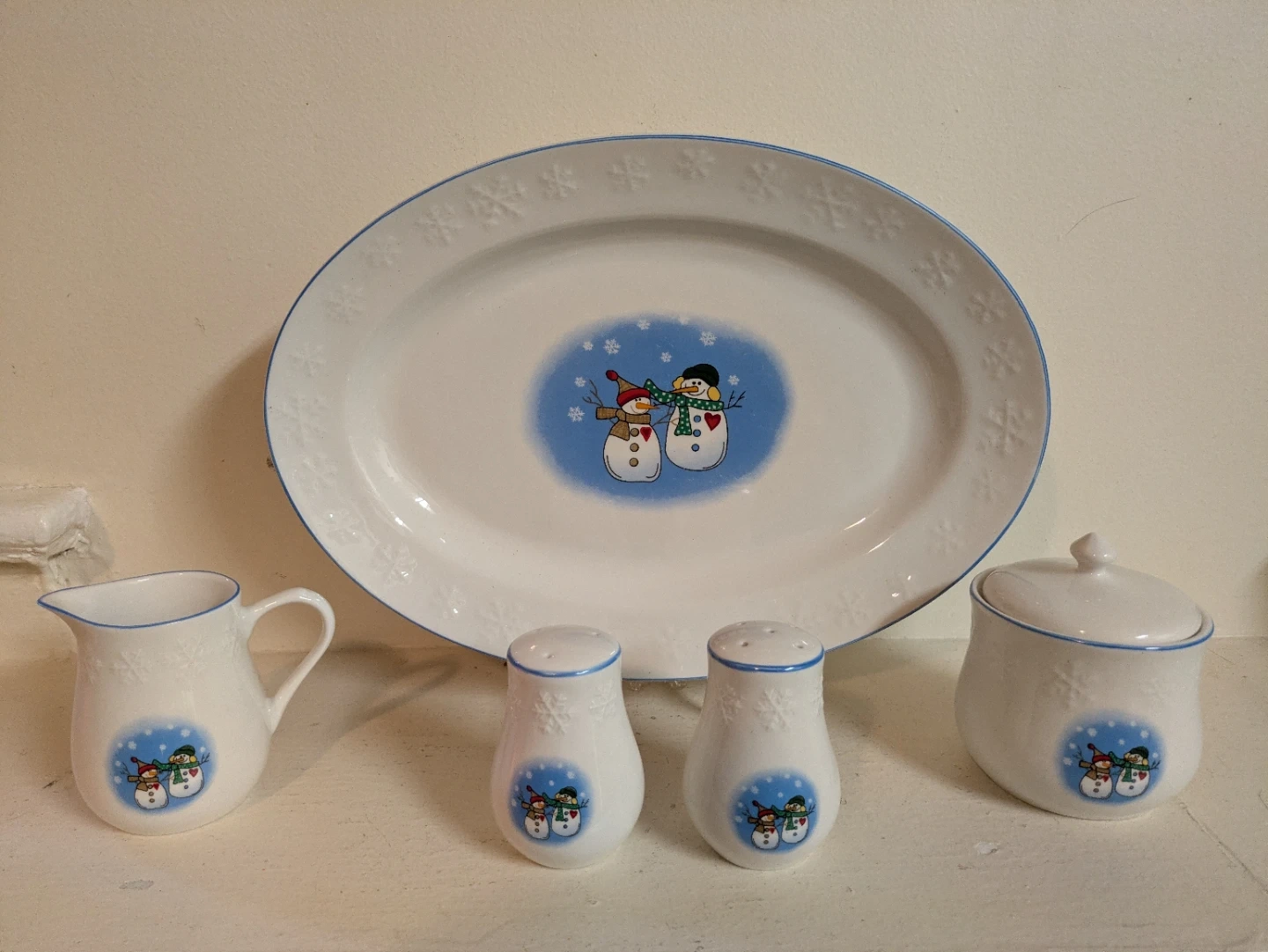 Selling a cute vintage china set featuring a snowman design! Includes a platter, creamer, sugar bowl, and salt and pepper shakers. Perfect for adding a touch of winter charm to your table setting. Pick up in the West End of Vancouver