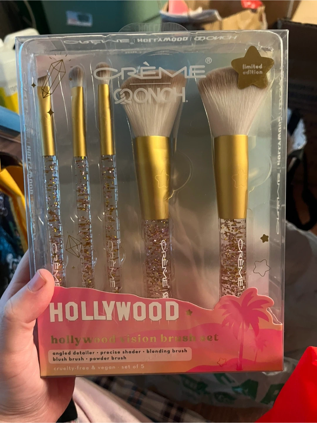 Brand new Crème Shop Hollywood Vision Brush Set in its original packaging! This set includes five cruelty-free and vegan brushes: an angled detailer, a precise shader, a blending brush, a blush brush, and a powder brush. Perfect for creating a variety of makeup looks with versatile and precise application. The silky-soft bristles are durable and easy to wash. Get ready to apply and blend with ease using this dreamy set of ultra-soft makeup brushes crafted with plush synthetic bristles!