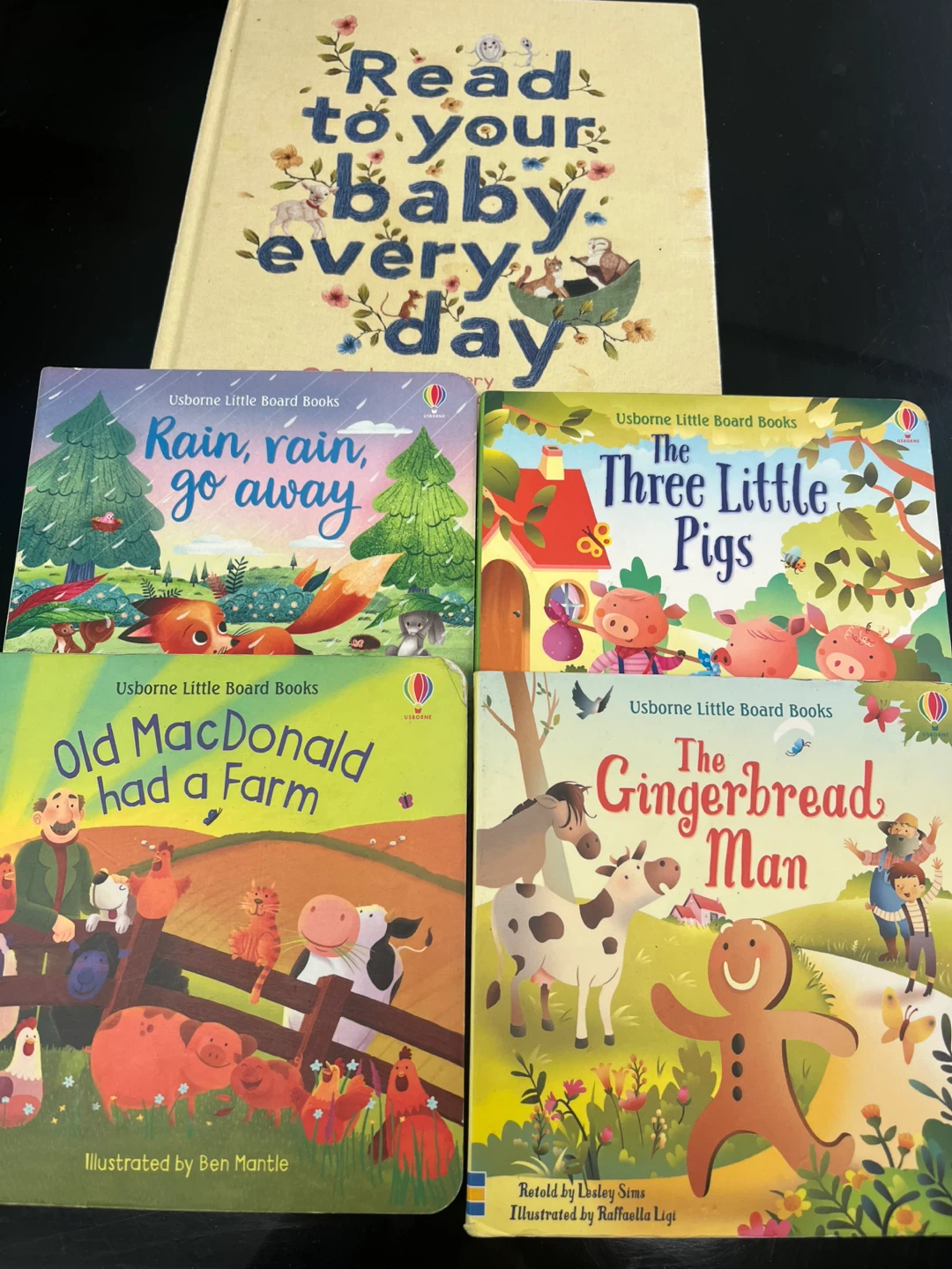 Selling a set of Usborne Little Board Books! Includes titles like 'Read to Your Baby Every Day,' 'Rain, Rain, Go Away,' 'The Three Little Pigs,' 'The Gingerbread Man,' and 'Old MacDonald Had a Farm'. Perfect for little ones!