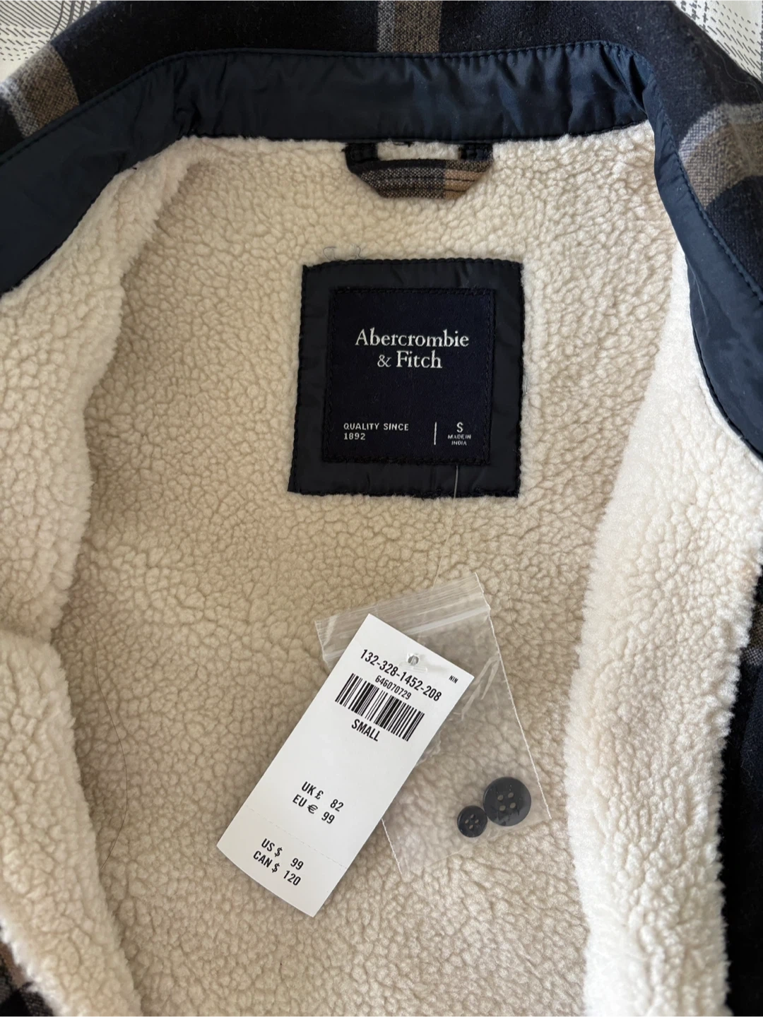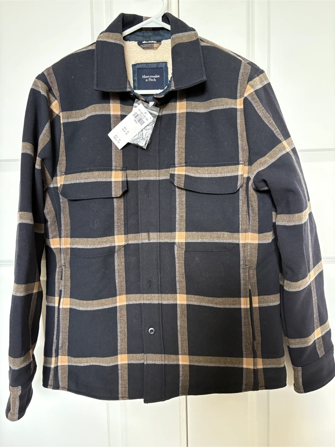 This Abercrombie & Fitch shirt jacket is perfect for adding a layer of warmth and style! It features a classic plaid pattern with a cozy sherpa