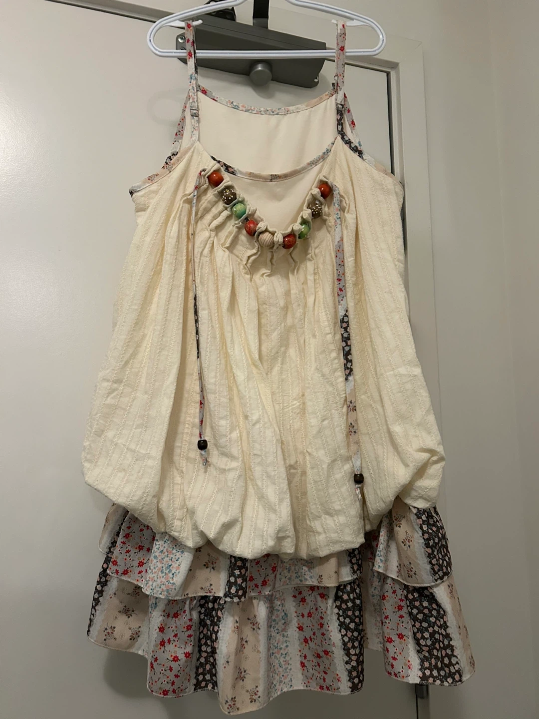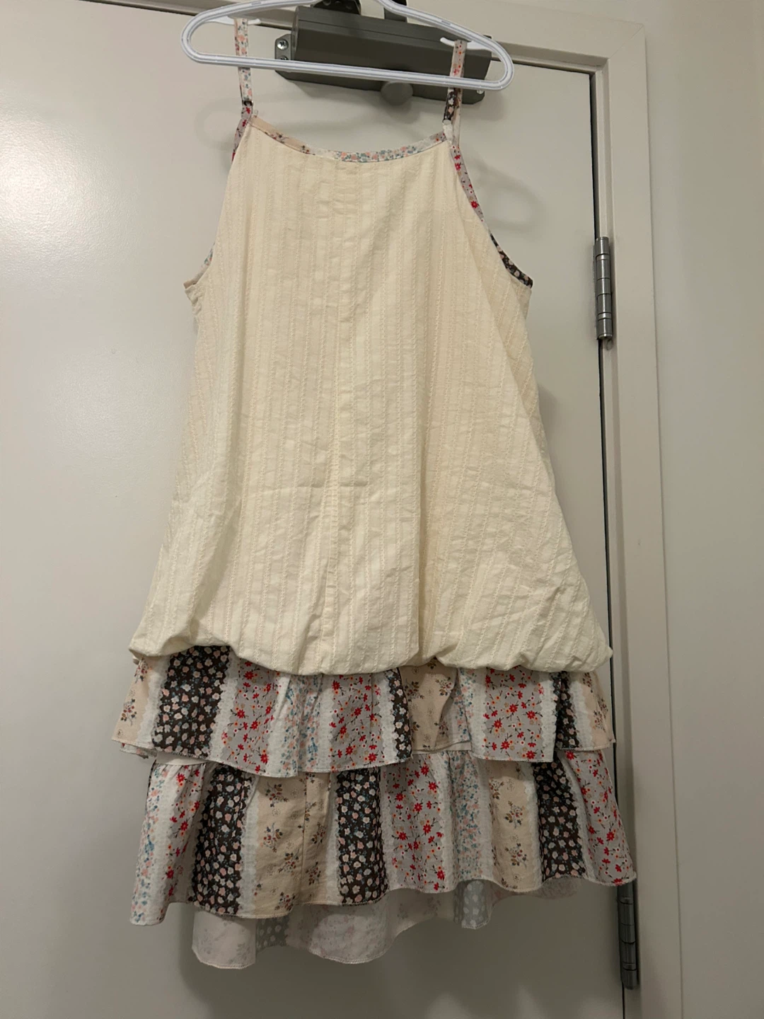 Super cute cream-coloured sundress with a tiered, floral-patterned skirt. It's in like new condition and perfect for summer and beaches! It can fit S-L.