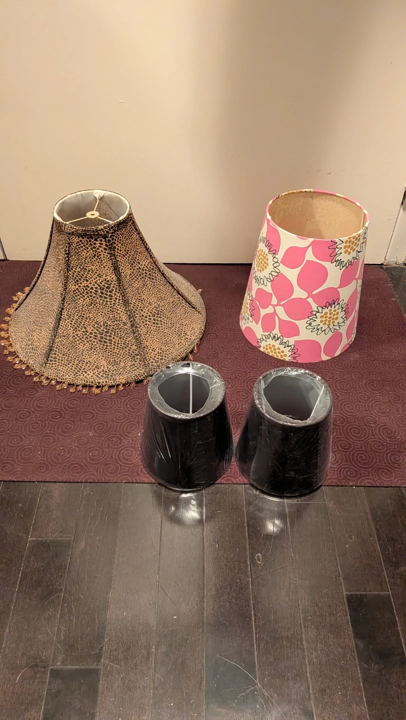 Selling four unique lamp shades! There's a leopard print shade with fringe, a pink floral shade, and two smaller black shades. Perfect for adding a touch of style to any room!
