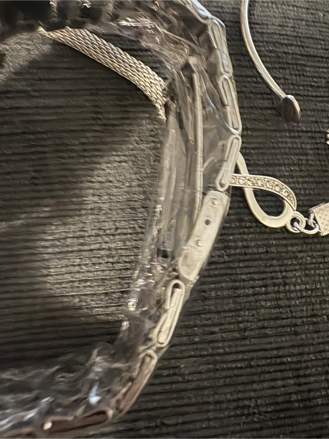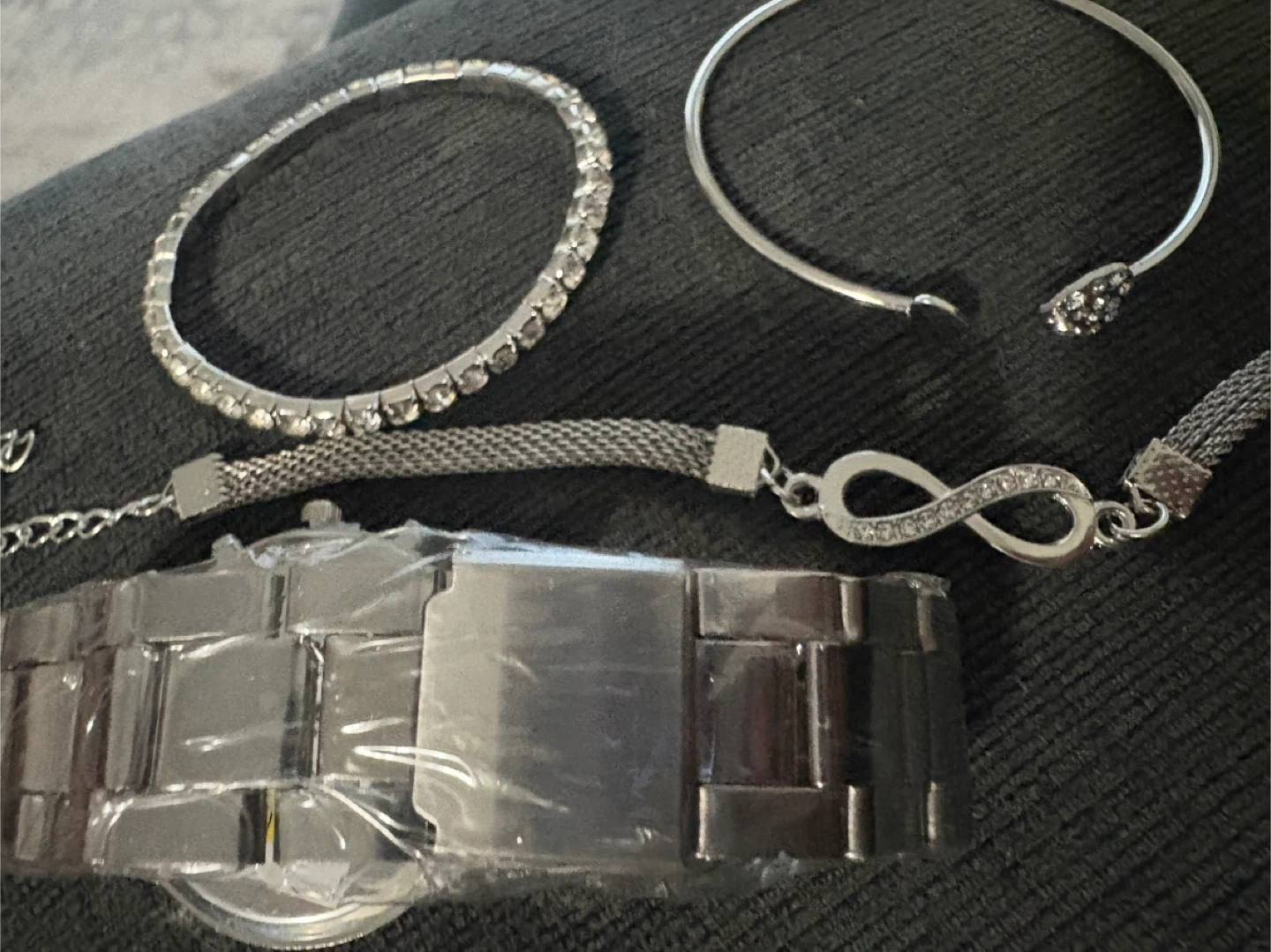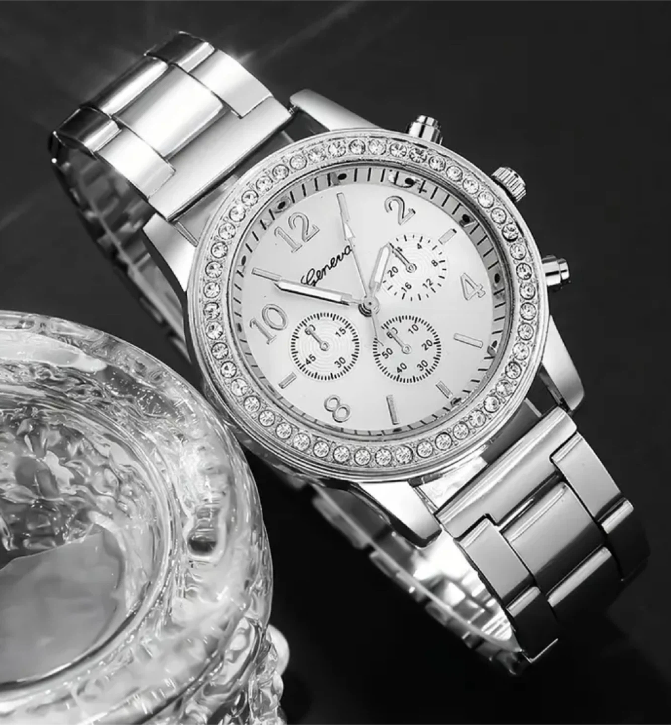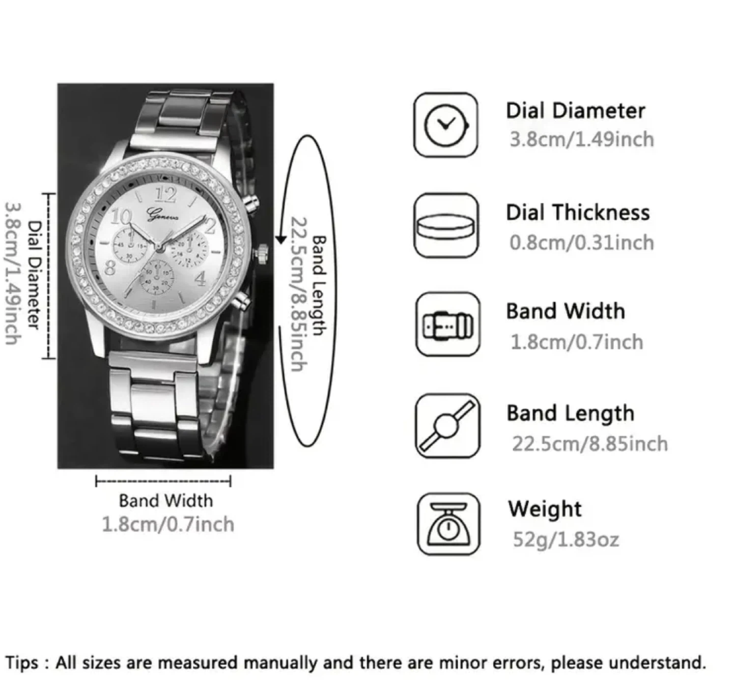 Selling a beautiful Geneva silver watch with a set of matching bracelets! The watch face has a dial diameter of 3.8cm (1.49 inches) and a dial thickness of 0.8cm (0.31 inches). The band width is 1.8cm (0.7 inches), and the band length is 22.5cm (8.85 inches). The bracelets are also silver and complement the watch nicely