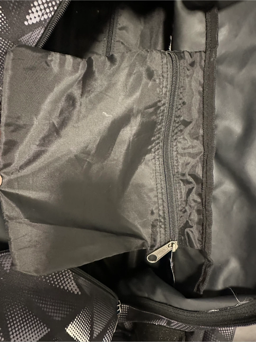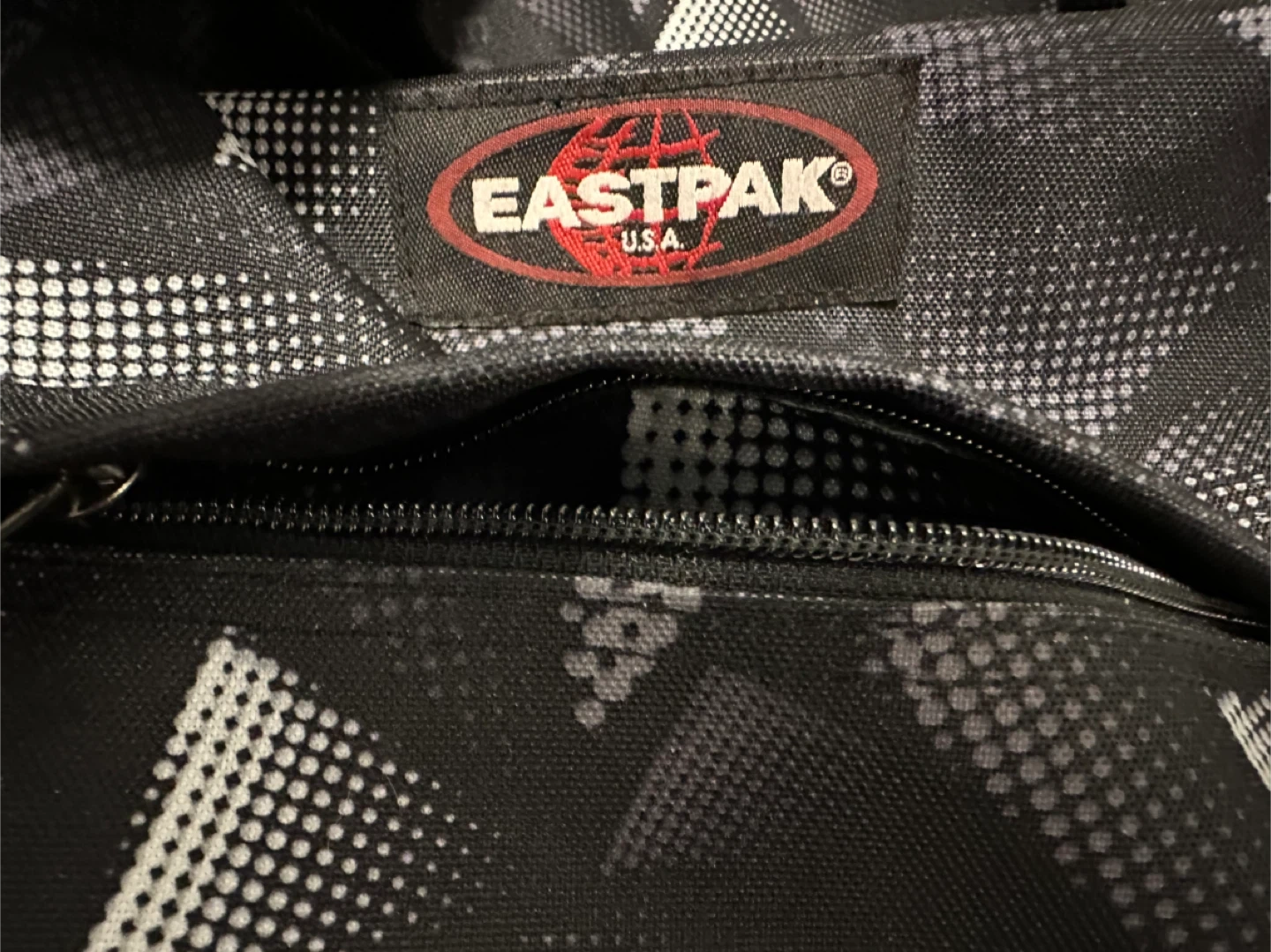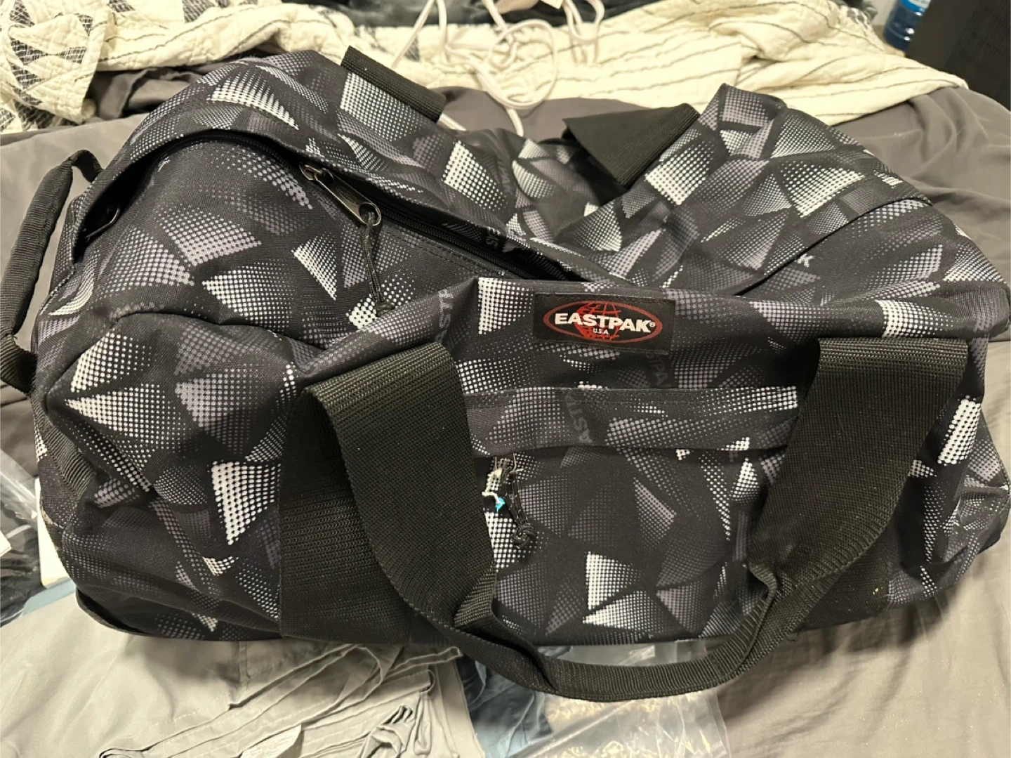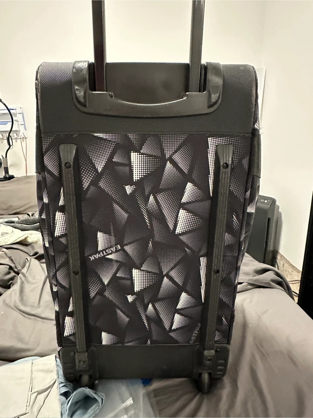 Eastpak wheeled duffle bag in a black and white geometric pattern. I believe it is approx 70L in size.