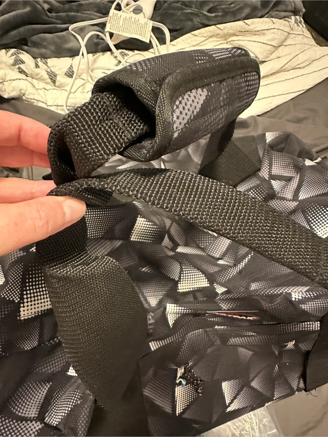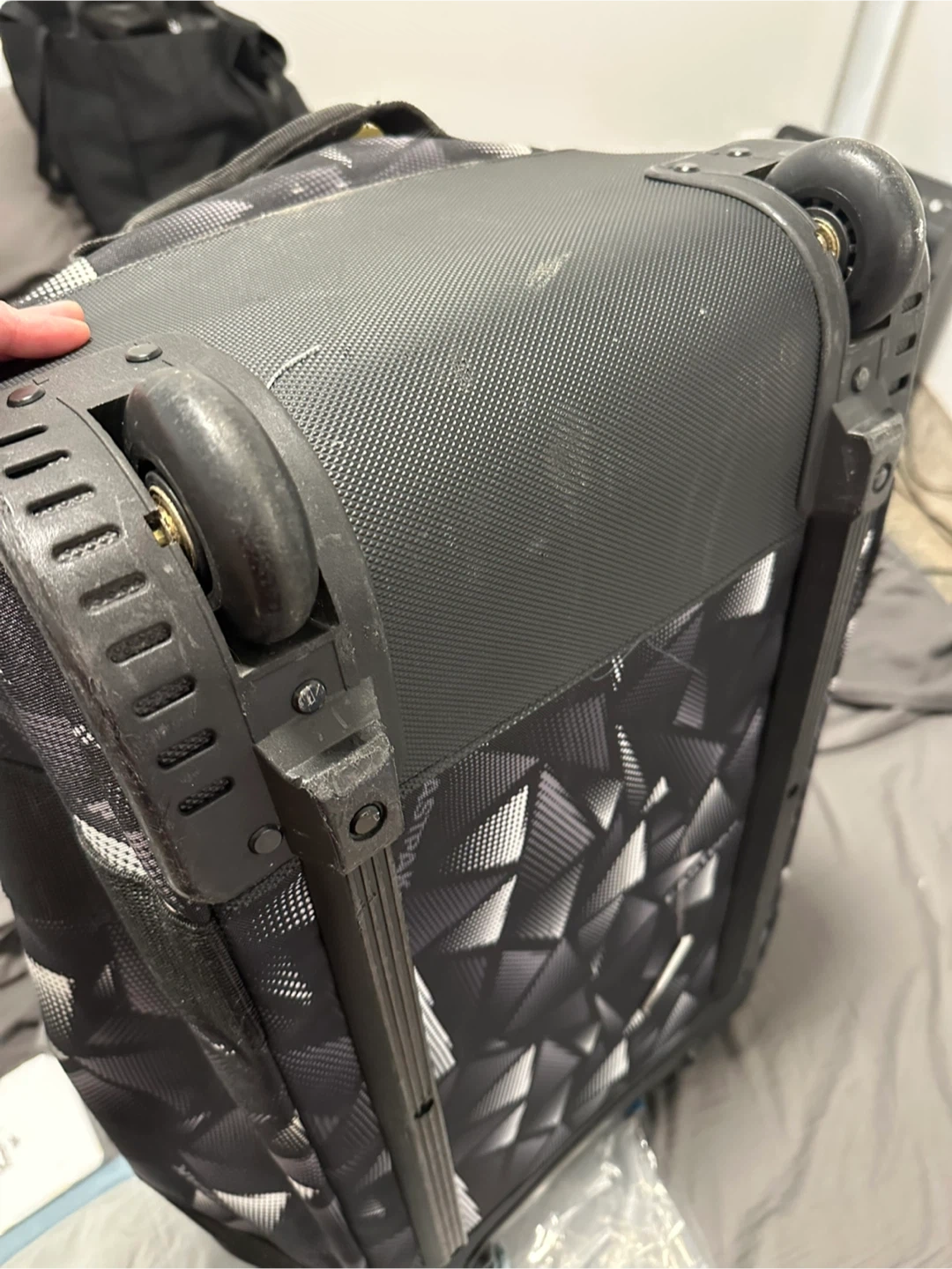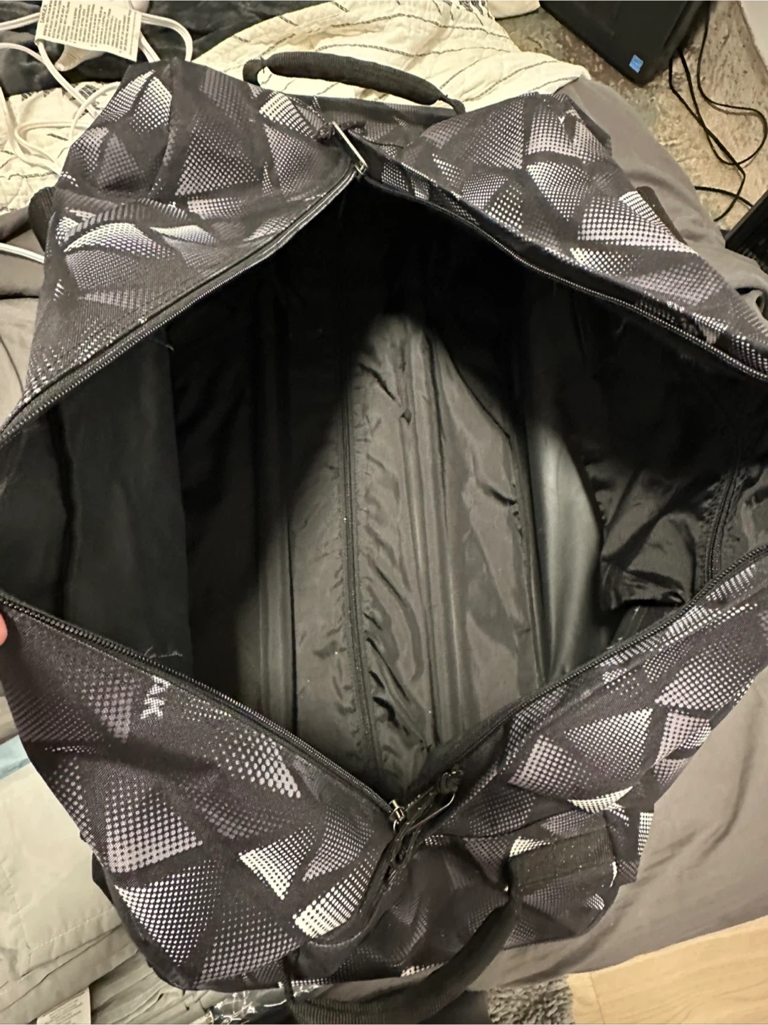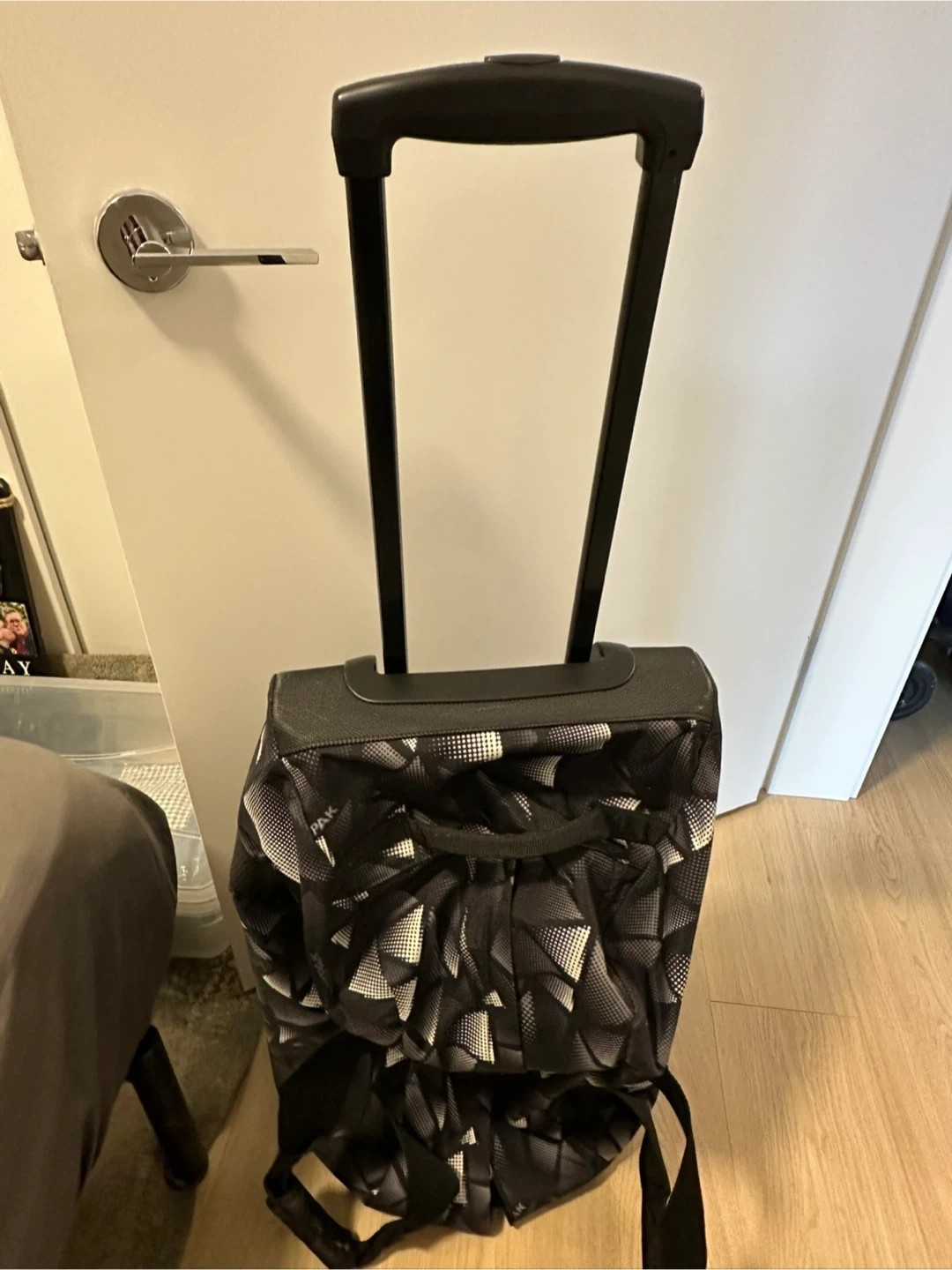 Eastpak wheeled duffle bag in a black and white geometric pattern. I believe it is approx 70L in size.
