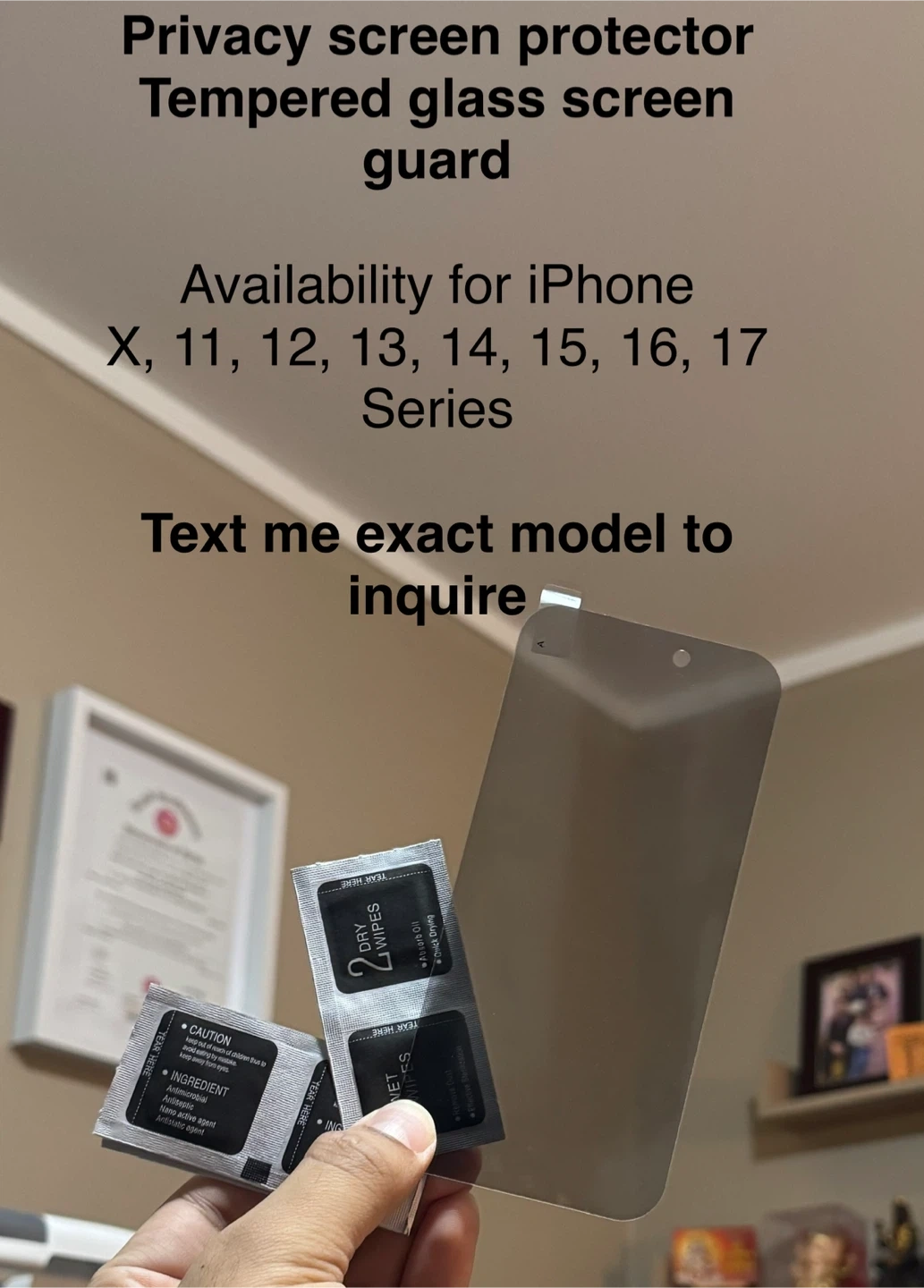 Selling a privacy screen protector for iPhones, including models X, 11, 12, 13, 14, 15, 16, and 17 series. It's a tempered glass screen guard. Comes with wipes to help with application