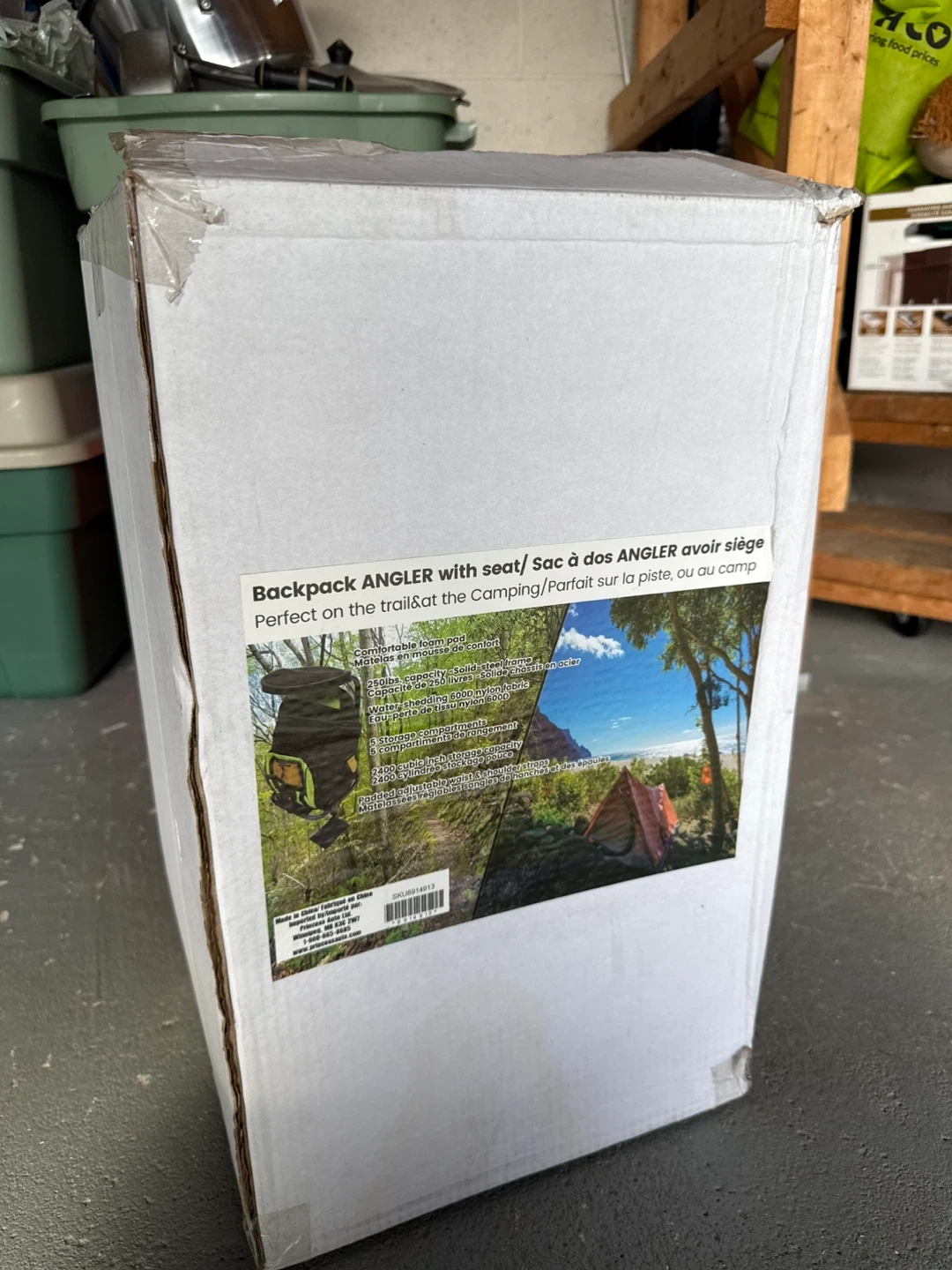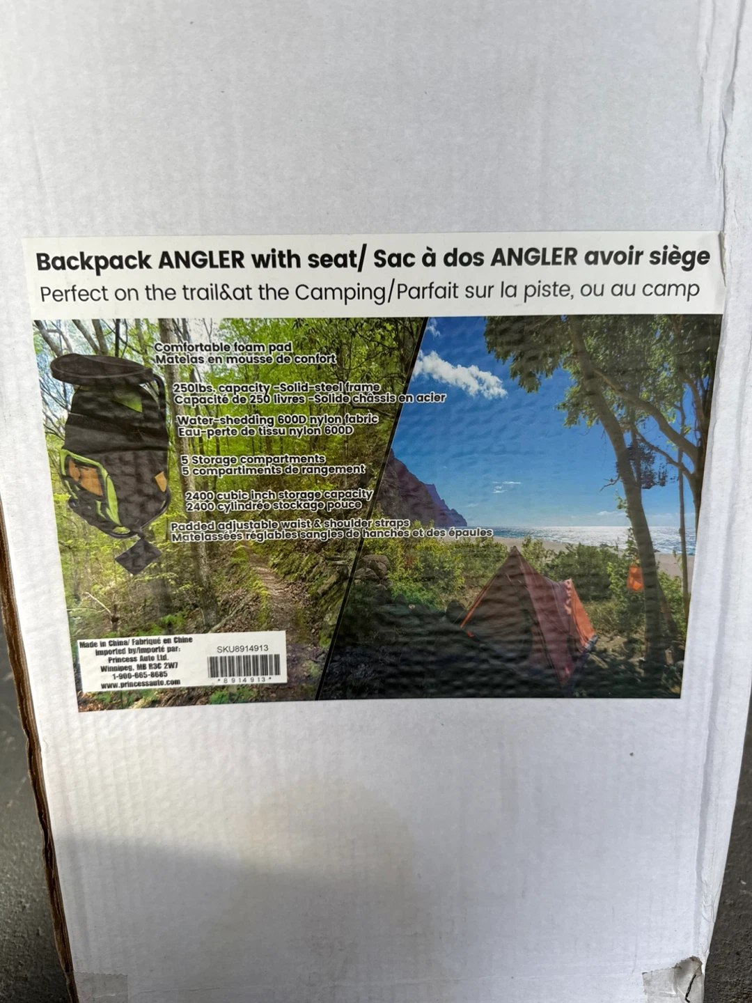 This is a Backpack Angler with a seat. It's perfect for camping or trails. It has a solid steel frame and comfortable foam pad. There are 5 storage compartments. The capacity is 2400 cubic inches.