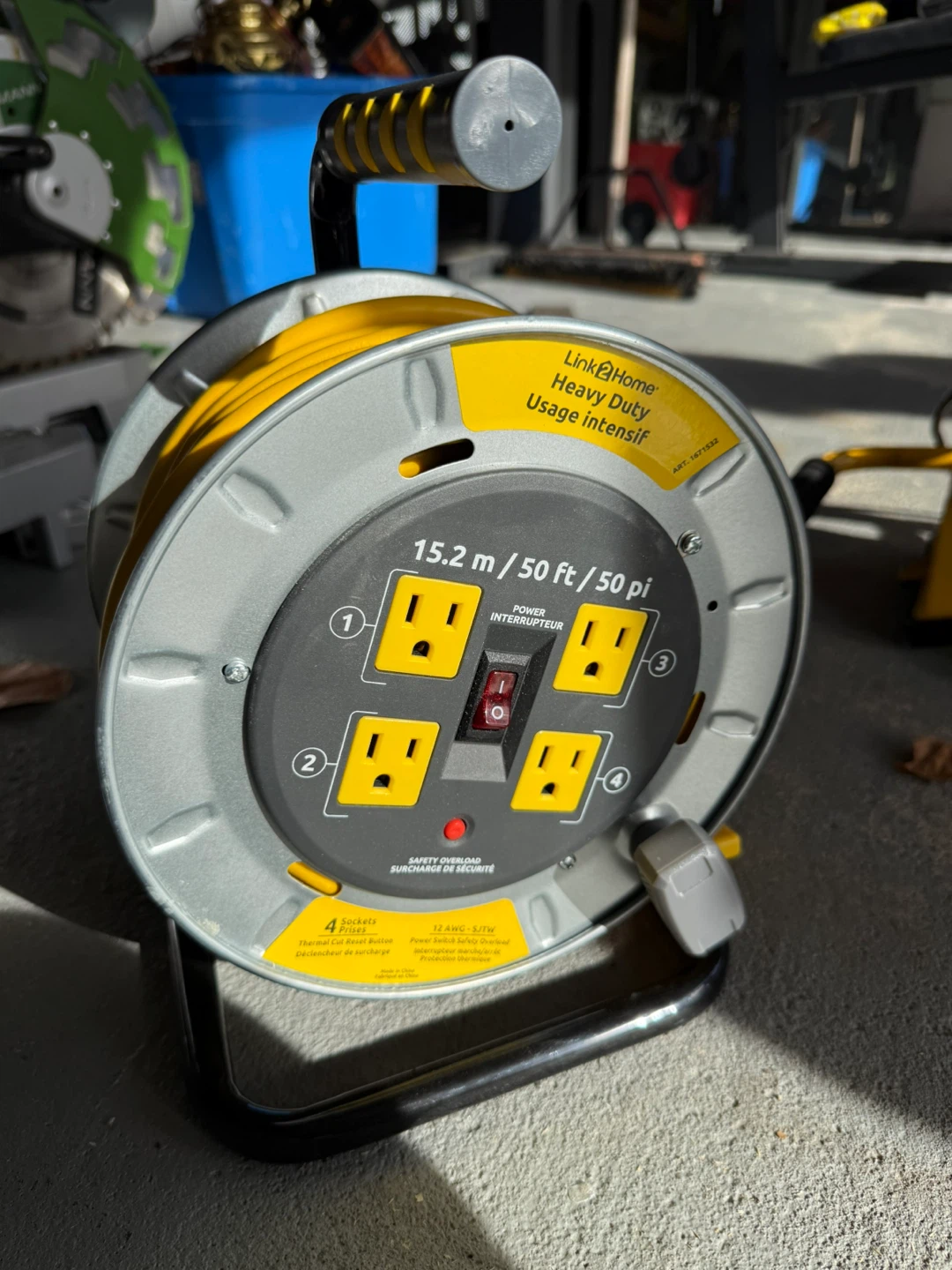 Selling a Link2Home heavy-duty extension cord reel. It's in great shape and ready to use! The cord is 50 ft long and the reel has 4 sockets. Perfect for any job around the house or worksite!