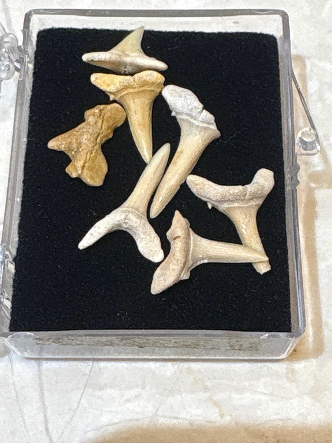 Selling a collection of fossilized shark teeth! They come in a clear display case with a black background