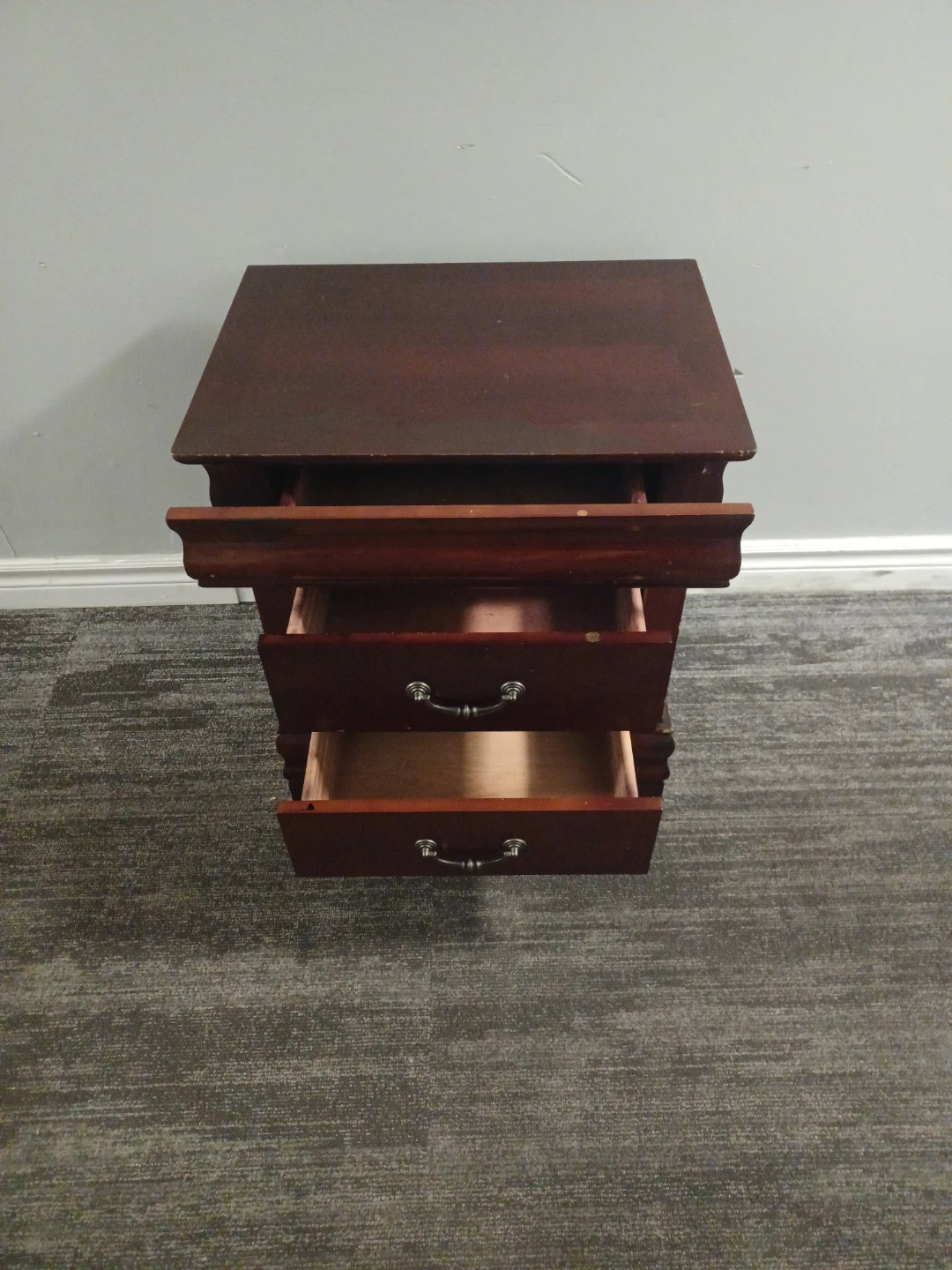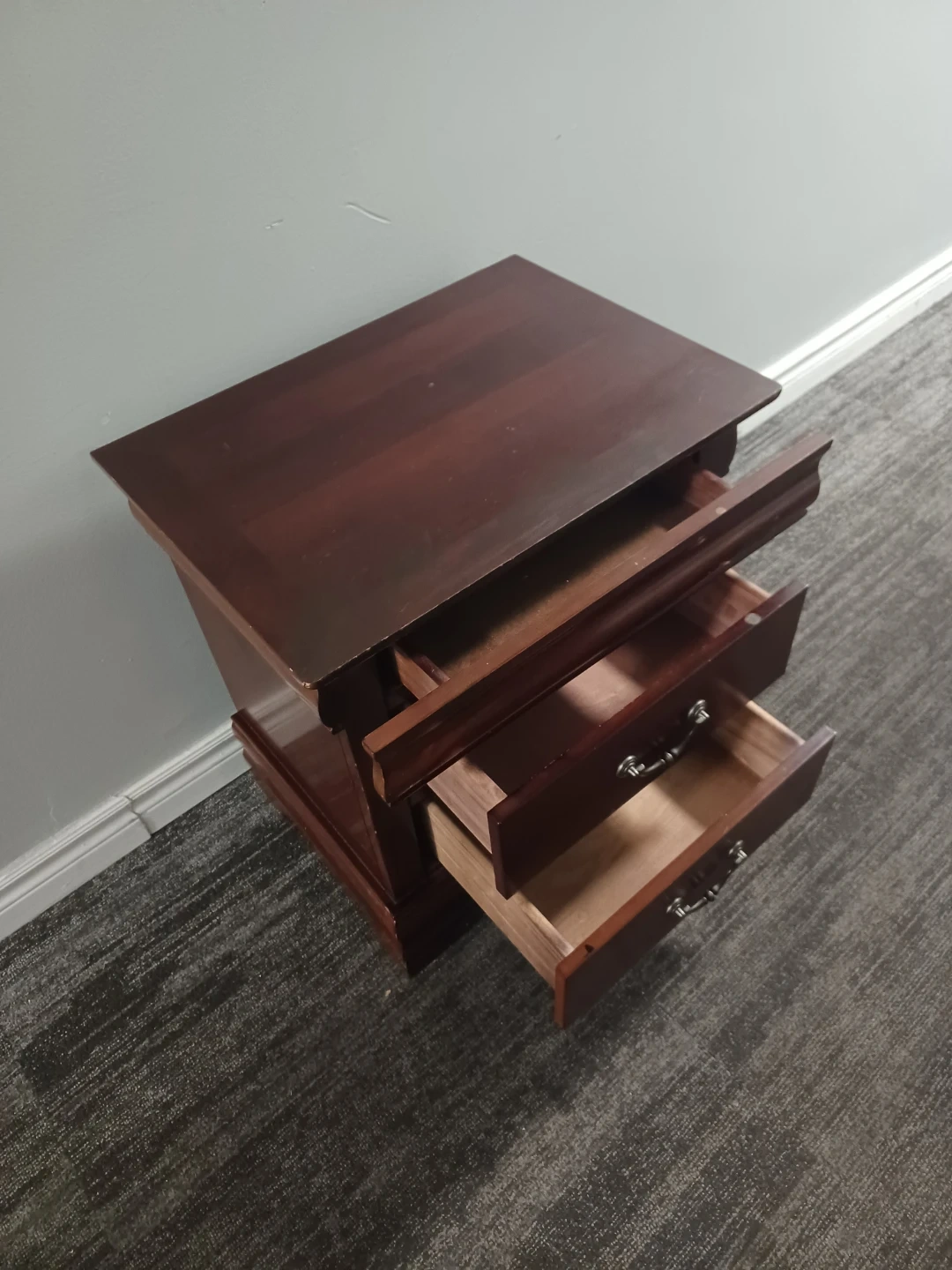 Selling a wooden nightstand with three drawers. It's in good condition and would be a nice addition to any bedroom. Uses but few minor Chios. Very strong wooden product.