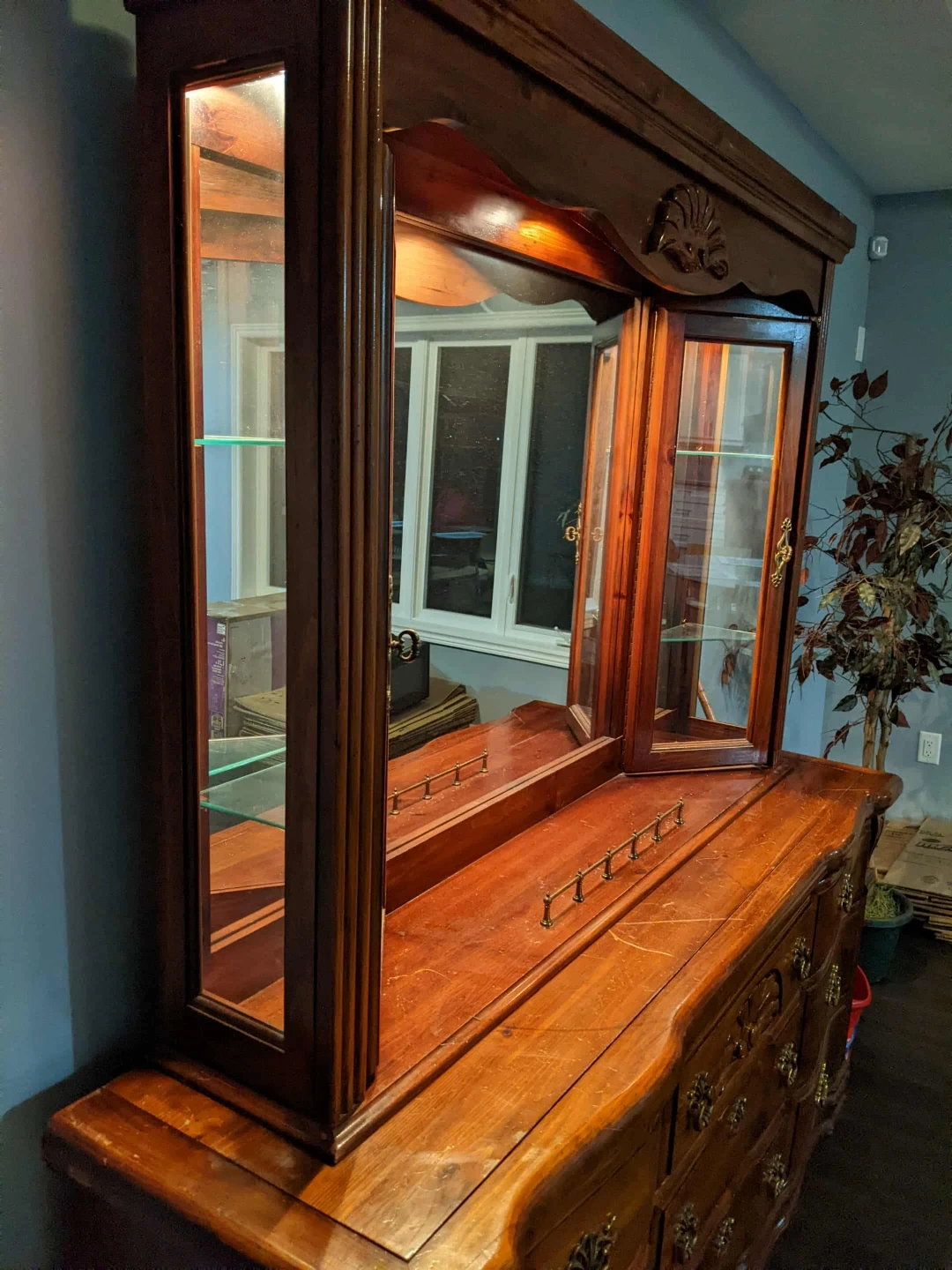 This is a beautiful wooden hutch with a glass display. It has a lovely warm tone and intricate detailing, perfect for adding character to any room. It features glass shelves and doors for showcasing your favourite items. The hutch provides ample storage space with drawers and cabinets.