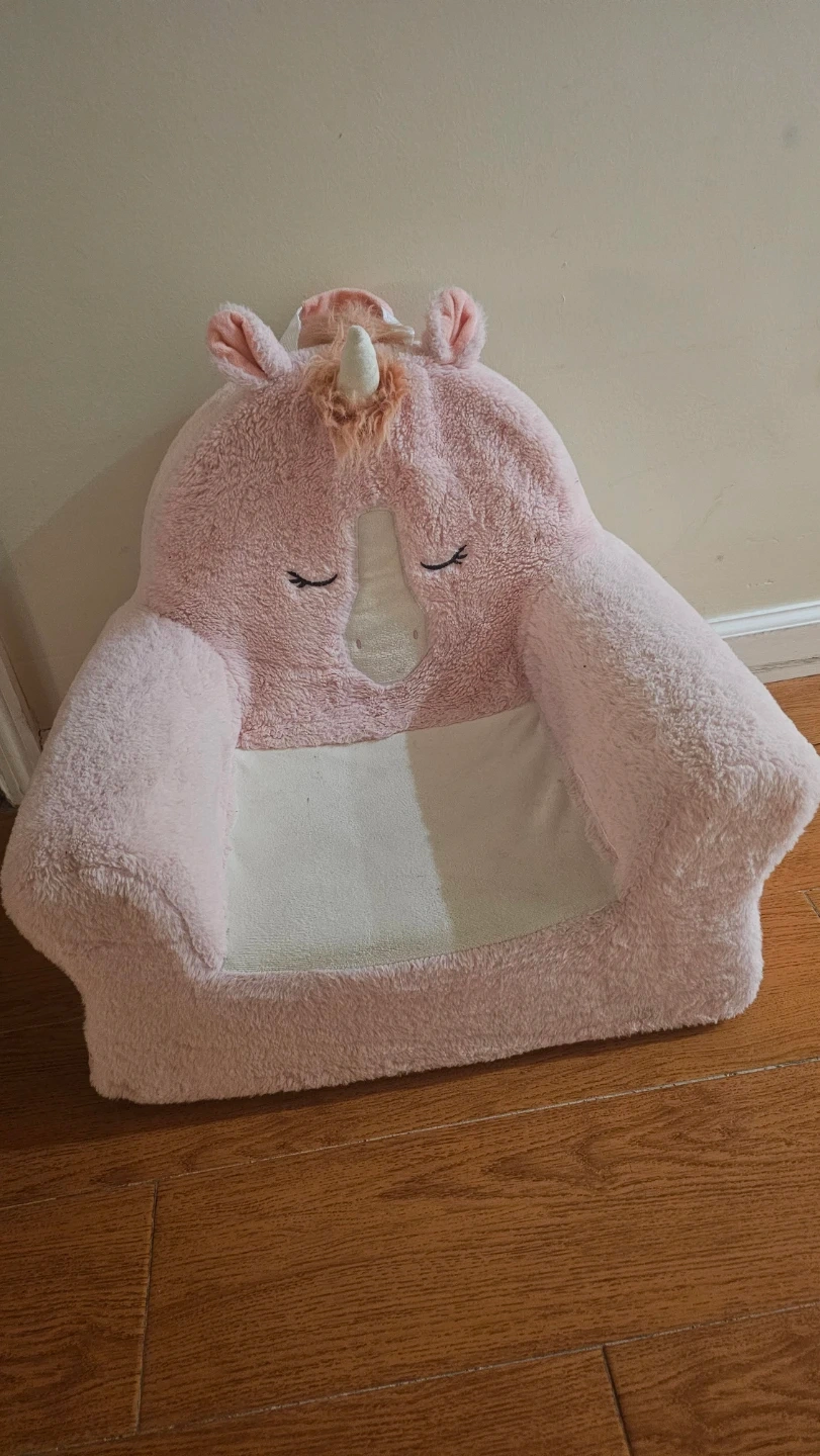 This is a super cute pink unicorn plush armchair for kids! It's in great condition and would look adorable in any child's room. Perfect for reading, playing, or just relaxing