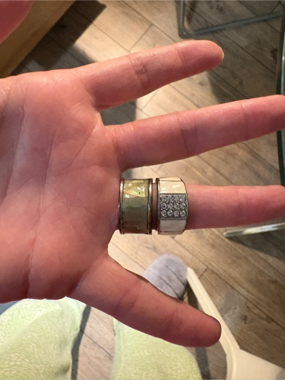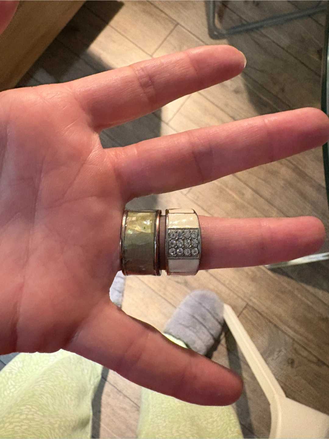 Selling two fashion rings. One is gold-toned with a textured finish, and the other is white with a grid of small stones. They're in good condition and ready for a new home!
