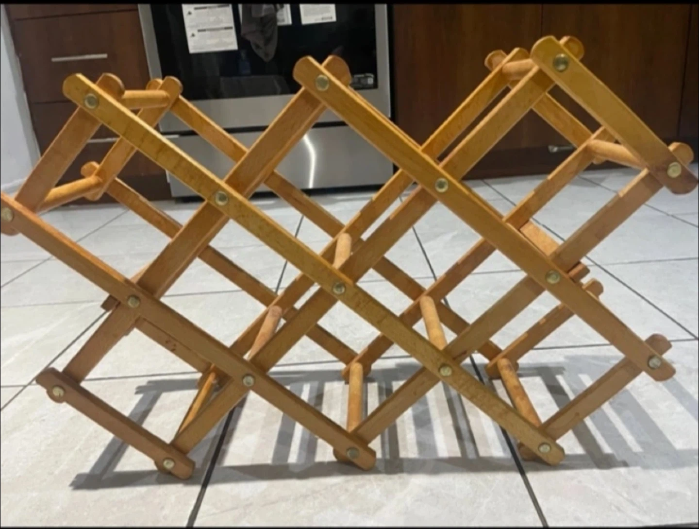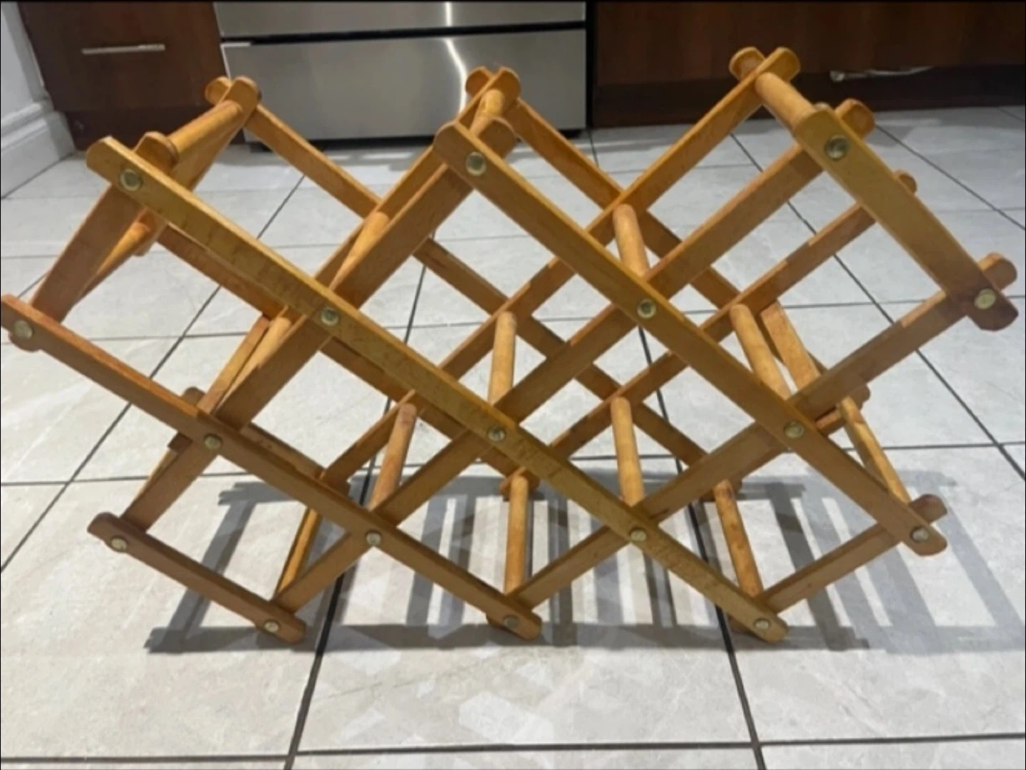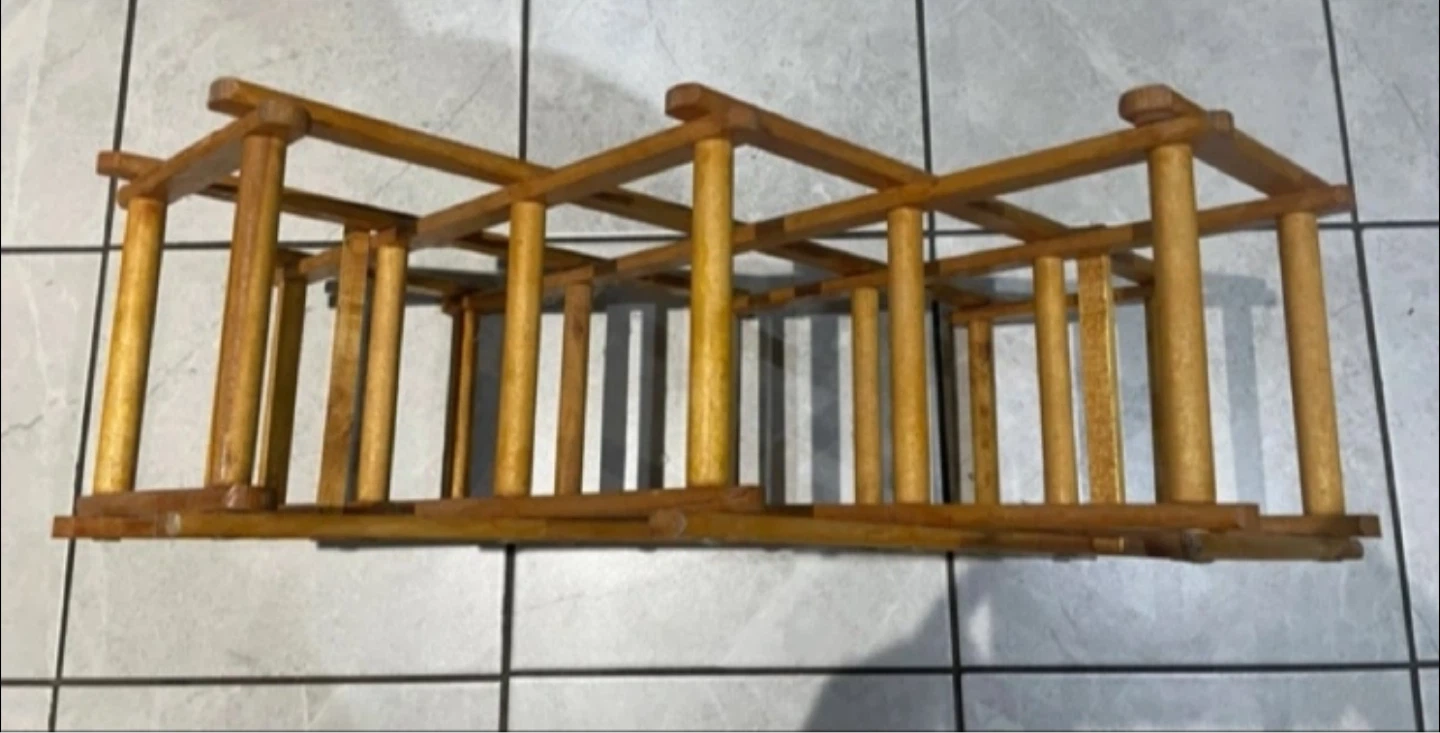 Selling a wooden wine rack that can hold up to 10 bottles. It's in great shape and perfect for displaying your favourite wines in your kitchen or dining area. Folds up for easy storage when not in use