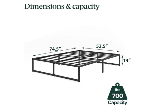 I'm selling a brand new Zinus 14-inch metal platform bed frame, designed for optimal mattress support and durability. This frame eliminates the need for a box spring and provides ample under-bed storage space. The frame supports up to 700 lbs. Zinus Full Bed Frame - ABEL 14 inch Metal Bed Frame with Steel Slat Support * Size: FULL * Height: 14 inches * Material: Steel * Weight Capacity: 700 lbs Just a heads up, if the ad's still up, it's available!