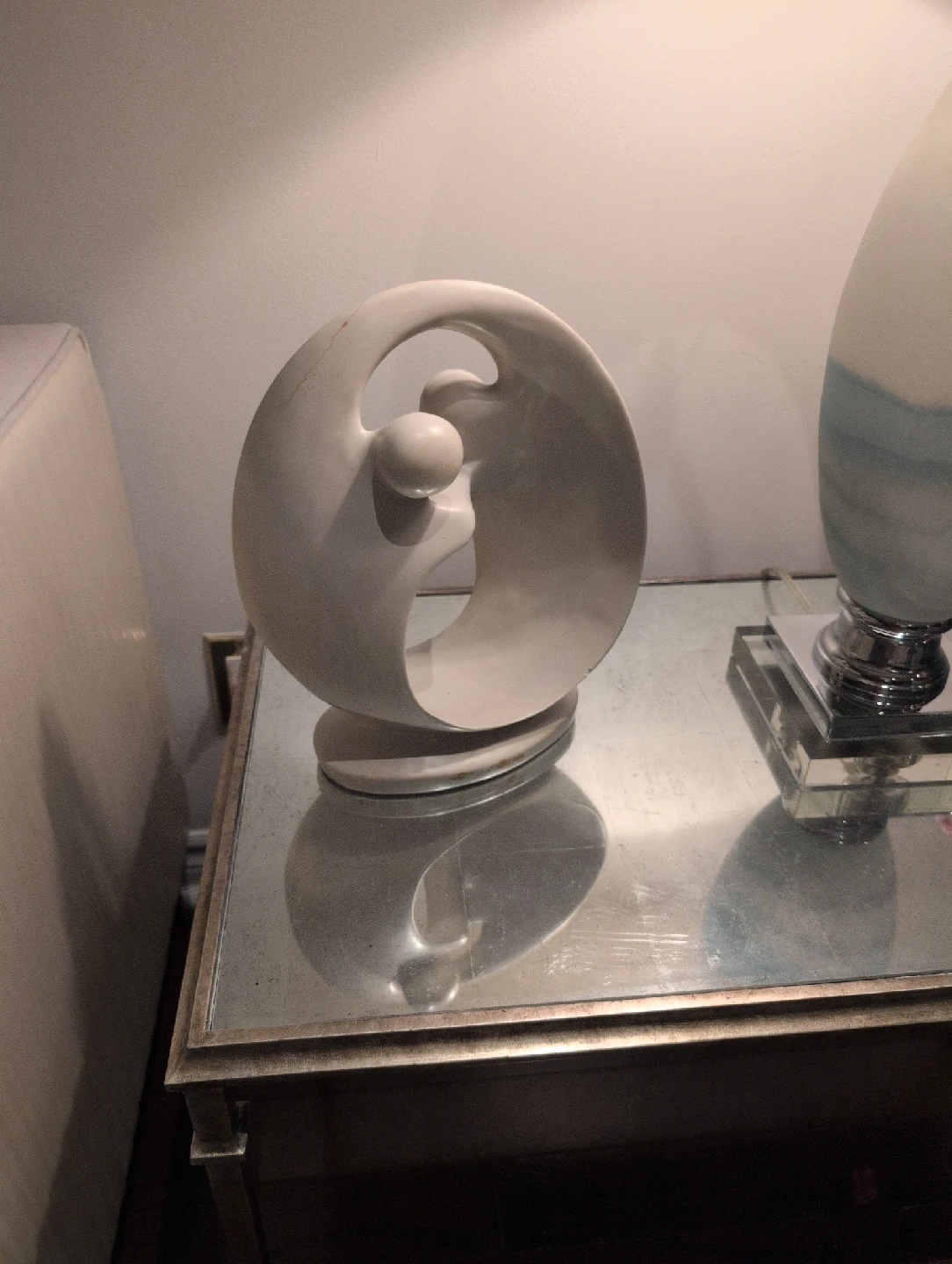 A unique abstract sculpture, perfect for adding a touch of modern art to your home! It's made of stone and features a smooth, rounded design. It has a few minor scratches. it's pretty heavy.