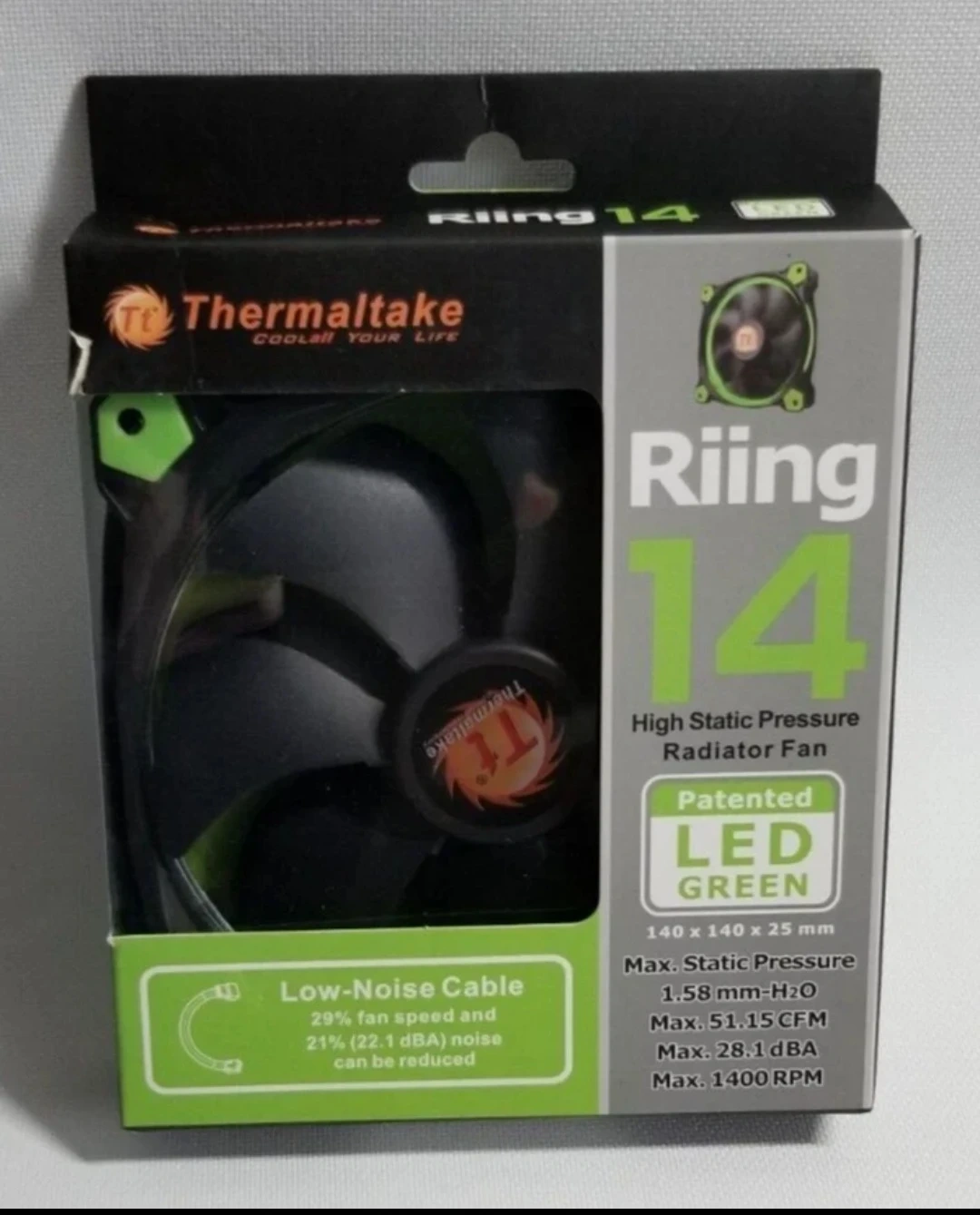 20The fan dimension is 140 x 140 x 25 mm. It comes with all the original components and the box! Thermaltake Ring 14 High Static Pressure 140mm Circular Ring Radiator / Case Fan Green For more information please visit the manufacturer's website Used, A+ grade condition Like new one - All accessories are included This unit have been fully tested and is fully functional