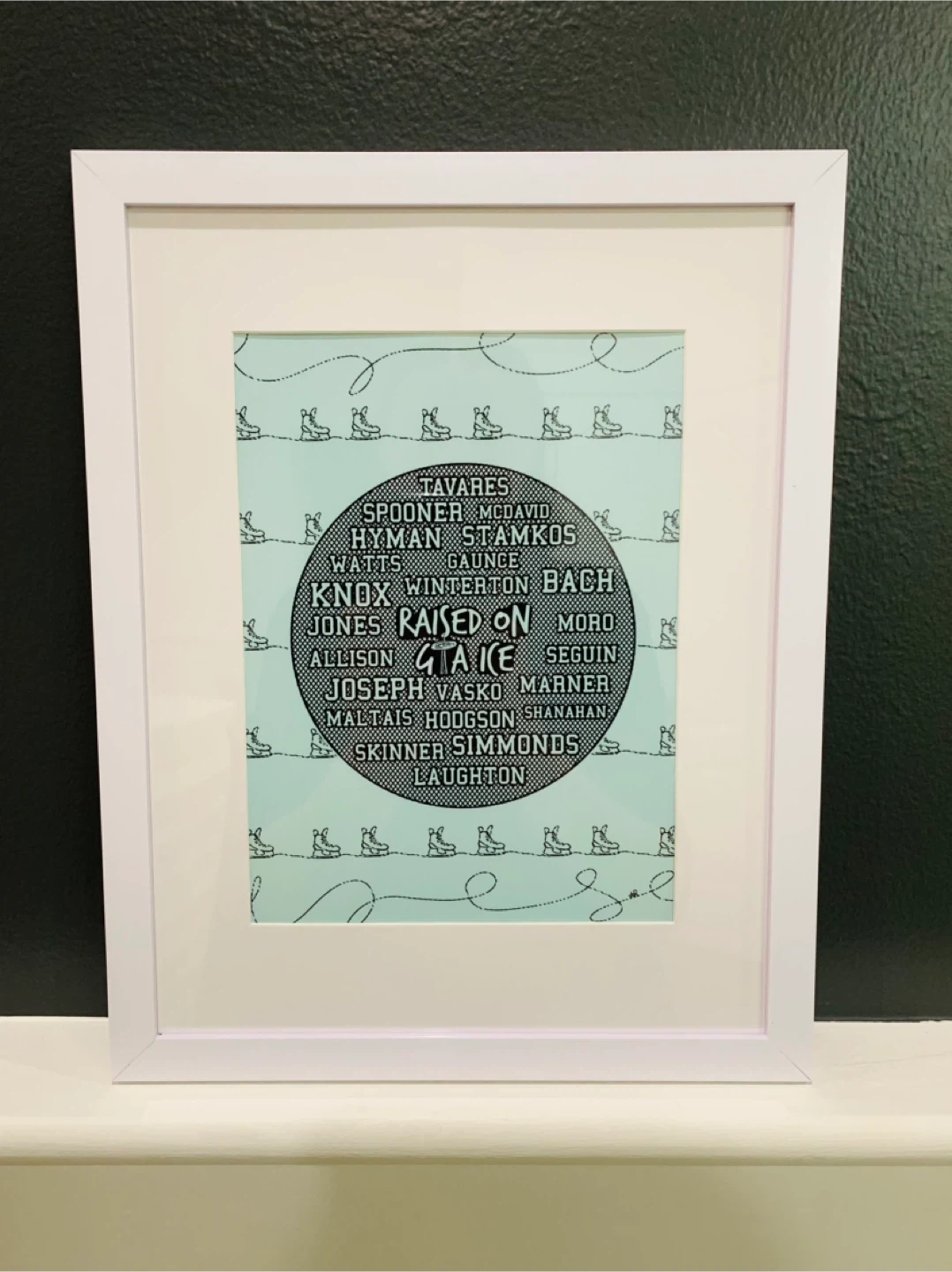 In a 9.5x12 inch frame. Awesome local decor for any little or big hockey fan.