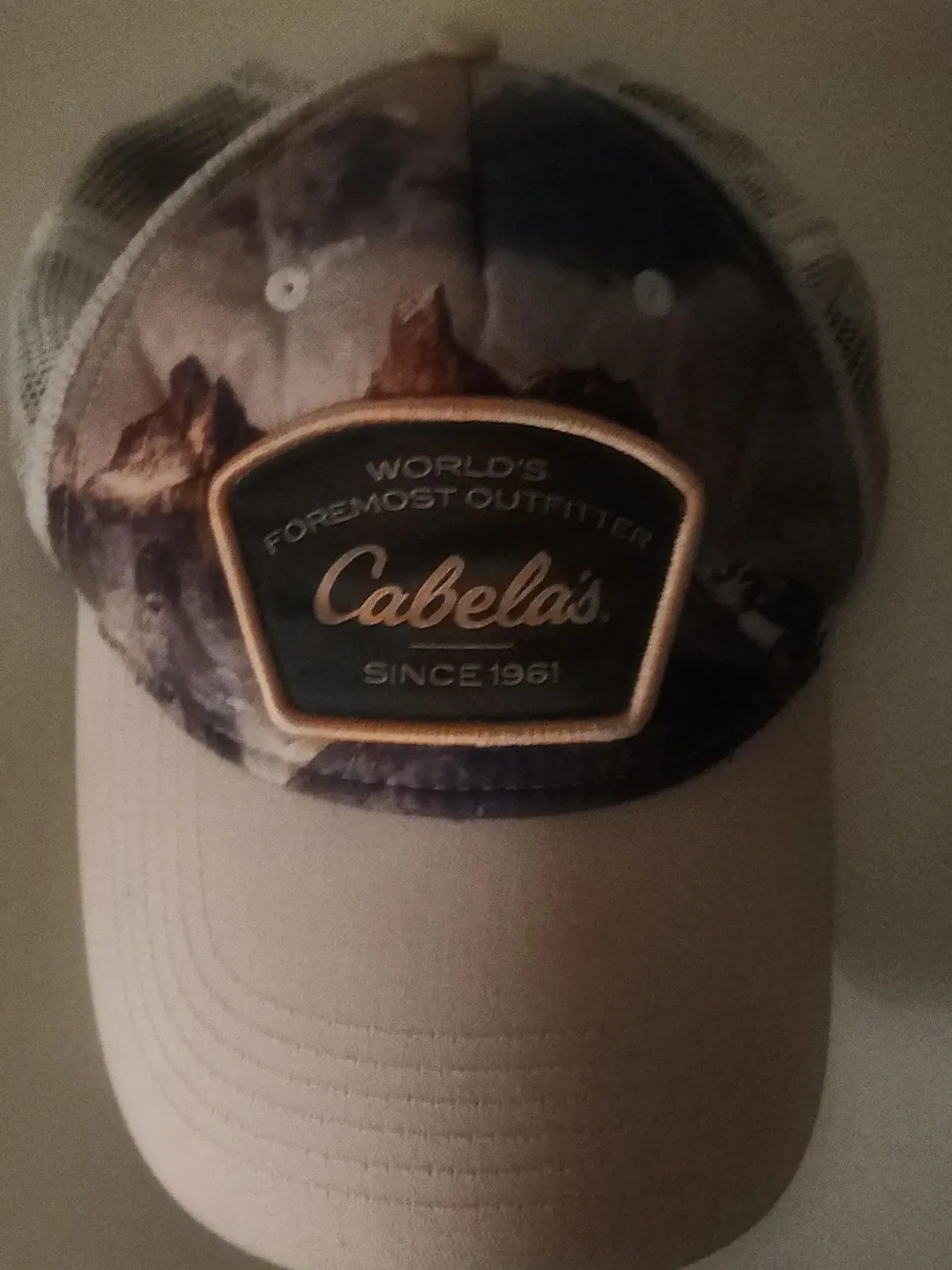 Selling a Cabela's trucker hat. It features a mountain scene on the front and a dusty rose brim. Great for outdoor adventures or everyday wear!