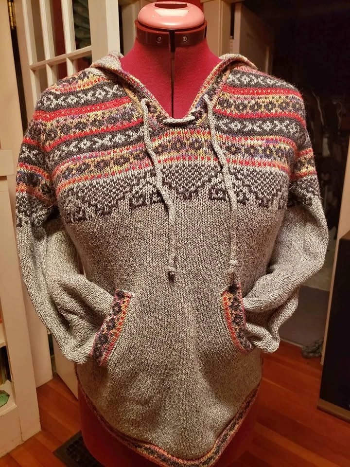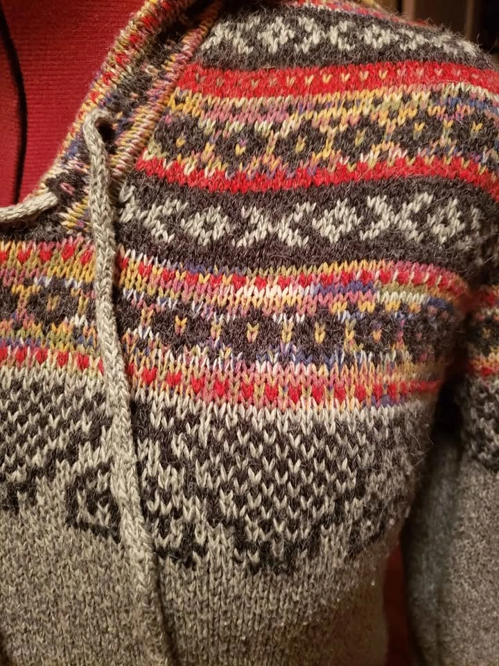 Beautiful Fair Isle hooded sweater from Papillon. Multicolored woven pattern detail over the shoulders and around the hood, cuffs, pockets, and hem. Size medium. Really well made and a good brand. Pick up in Upper Lonsdale North Vancouver. Cross posted.