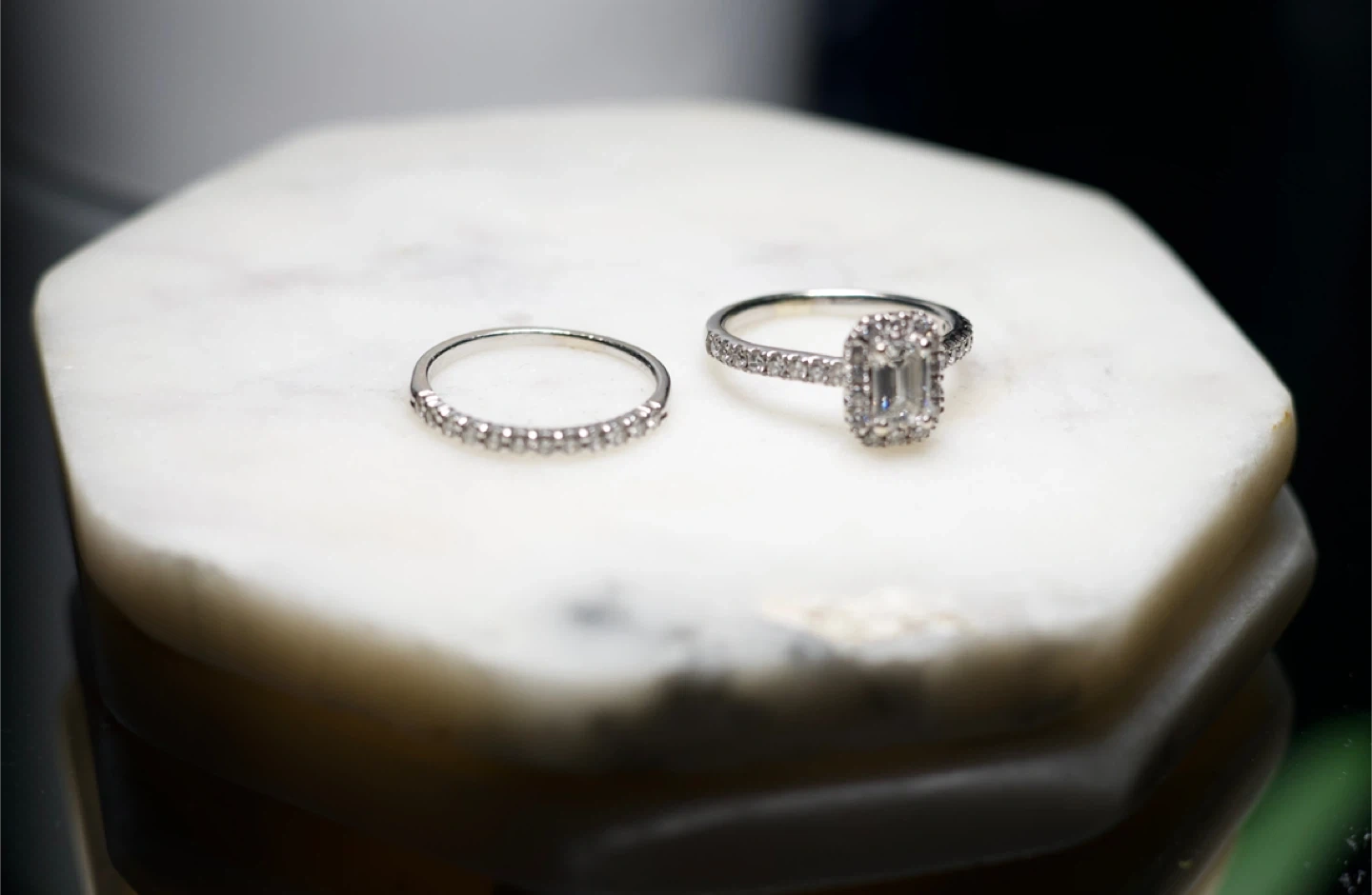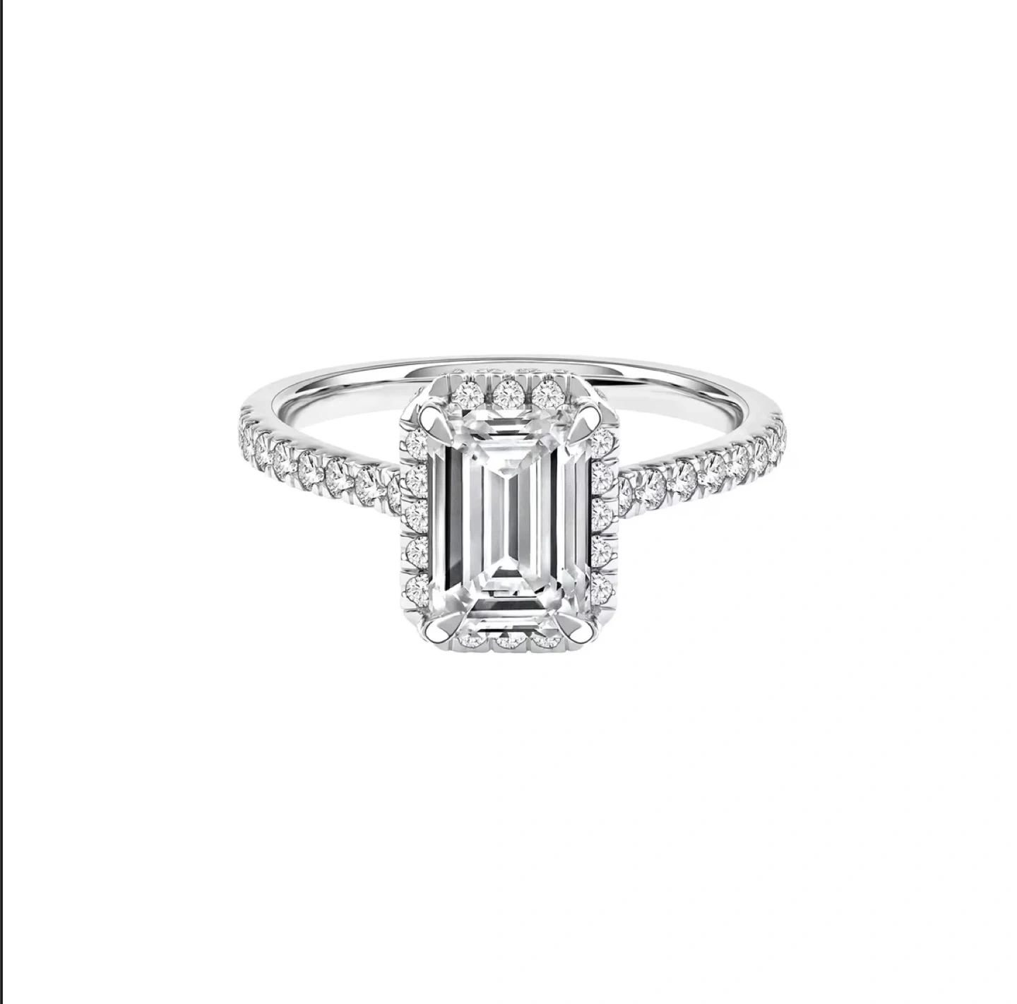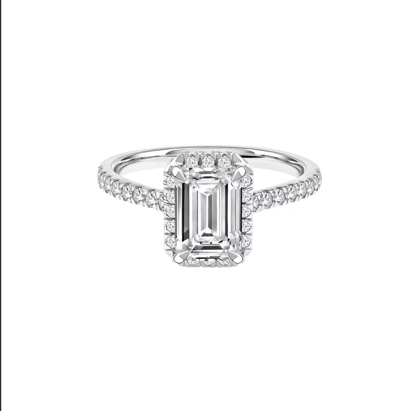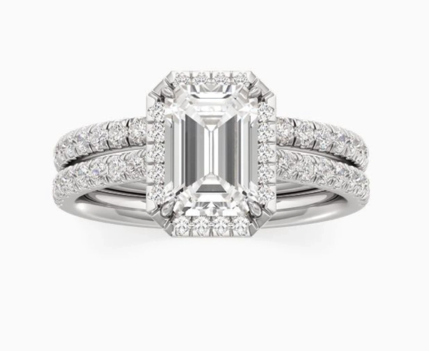 109New wedding ring set, size 6.5 Dazzle her with a radiant sparkle that lasts forever with this stunning lab grown diamond engagement ring. Crafted in timeless 14K white gold, this ring boasts emerald-cut center diamond complemented by 46 round brilliant cut lab grown diamonds. Proudly graded with the highest industry standards, each lab grown diamond boasts GCAL-certified greatness. Ring specifications: Metal: 14K White Gold Item Width: 10.00mm Style: Halo Gems Stone: Diamond Stone Shape: Emerald Stone Cut: Emerald Cut Diamond Center Stone Carat Weight: 1 1/4 ct. Diamond Carat Weight: 1 3/4 ctw Diamond Type: Lab Grown Diamond Minimum Color: HI Diamond Minimum Clarity: VS2 Center Diamond Certification: GCAL