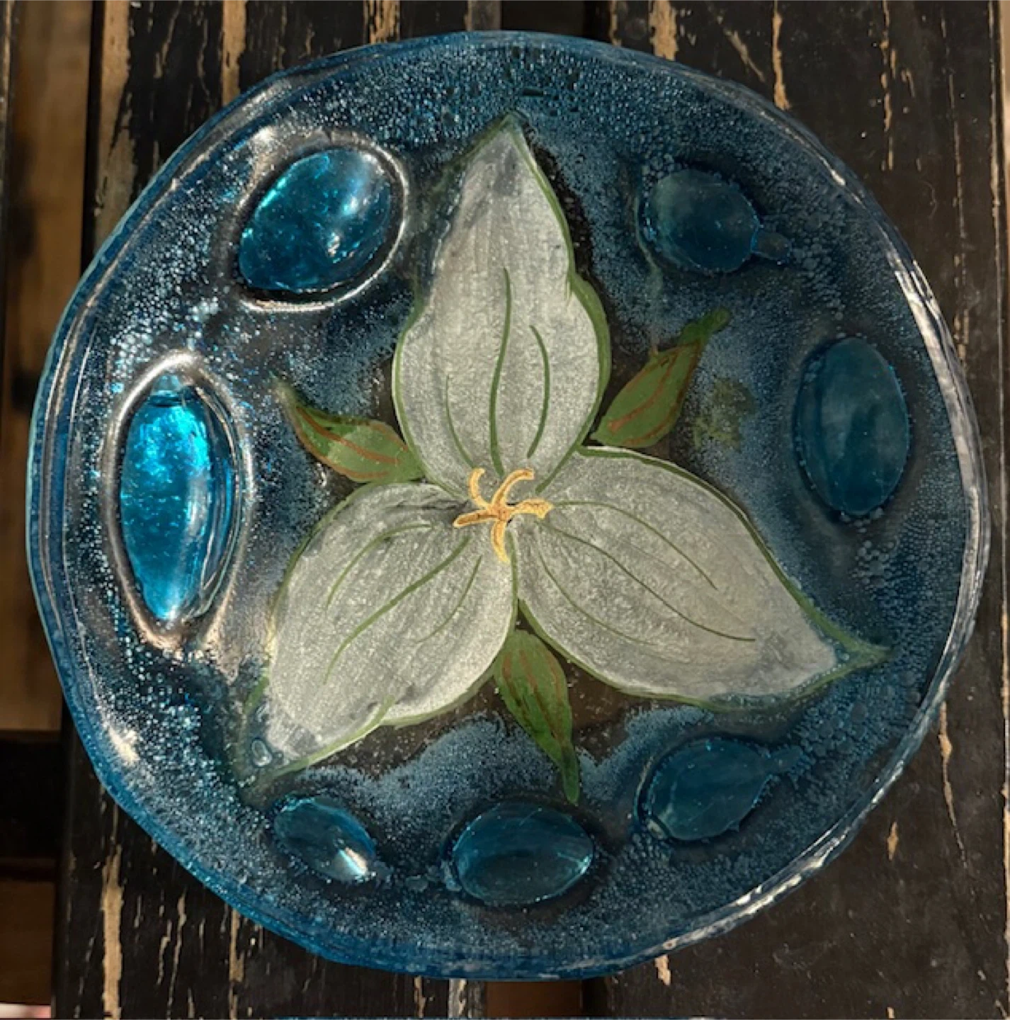 Selling a beautiful handcrafted small glass dish. It features a lovely trillium flower design and embedded blue glass beads around the edge. It would make a great decorative piece or catch-all! 🤩